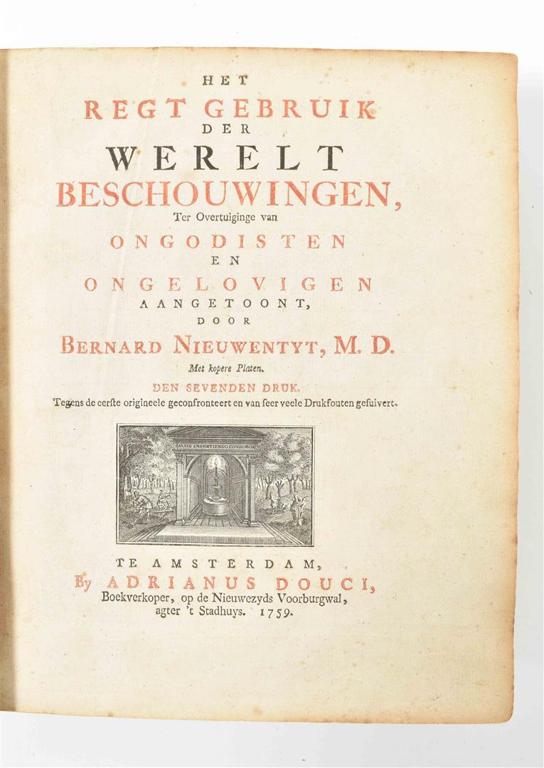 en ongelovigen aangetoont. Amst., A. Douci, 1759. 7th printing. (14),916,(17) p. Complete w. engr. title, title-p. vignette, engr. portrait of the author and 28 fold. engr. plates, large paper copy. Contemp. speckled calf. 4to.