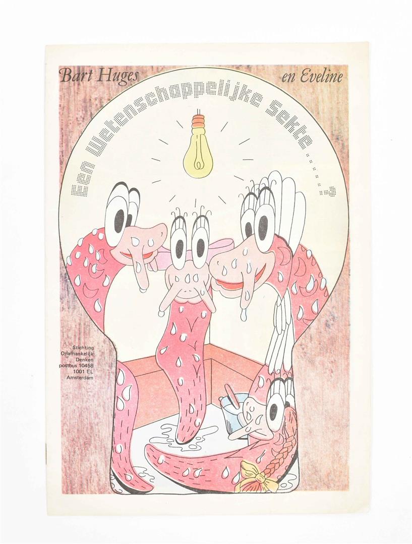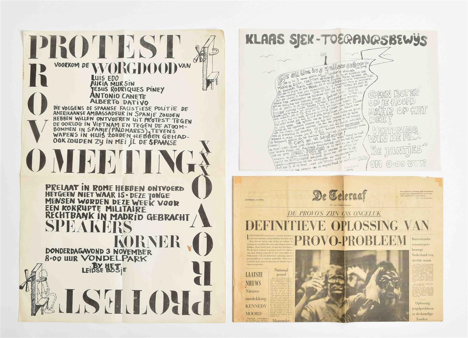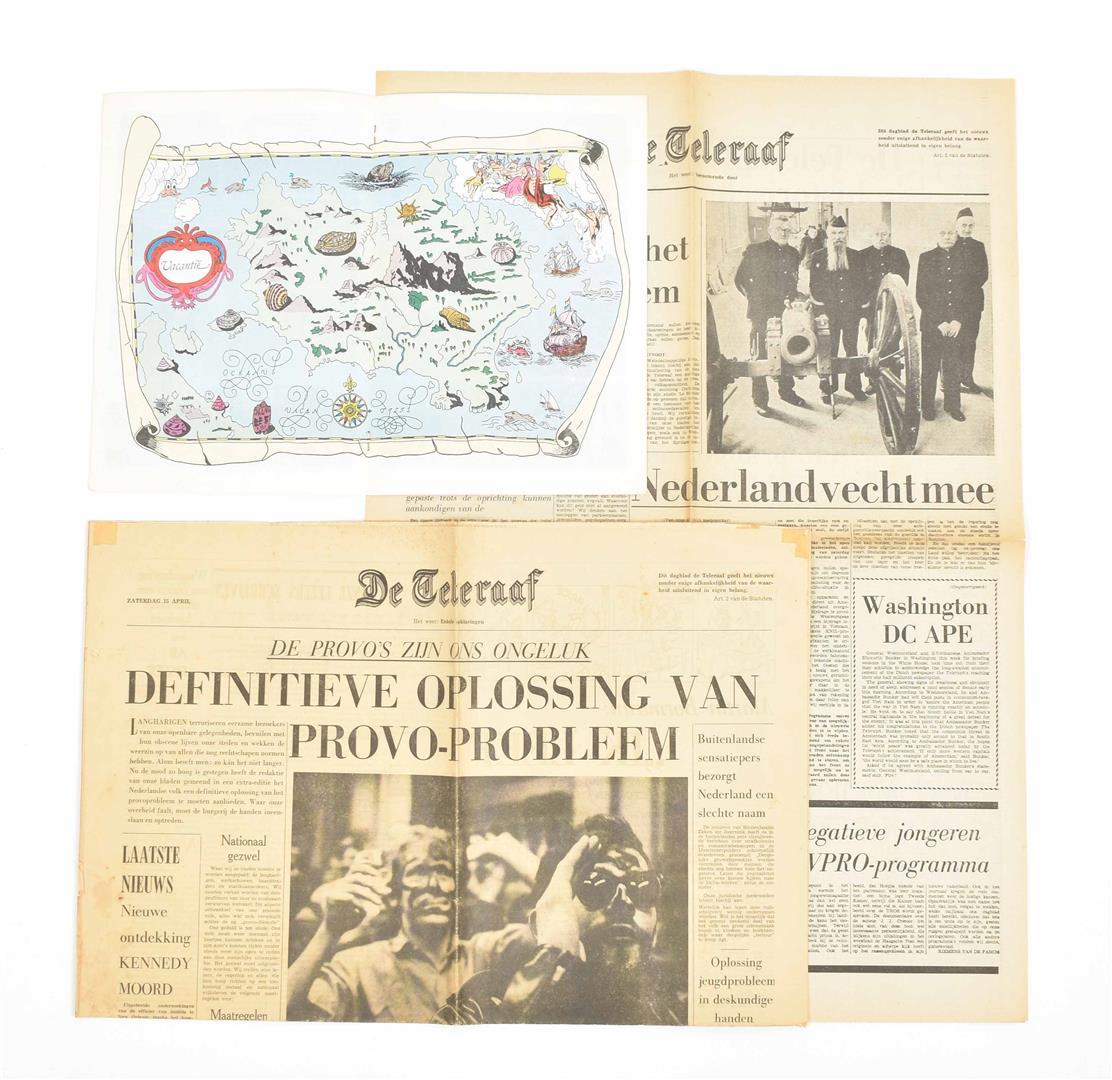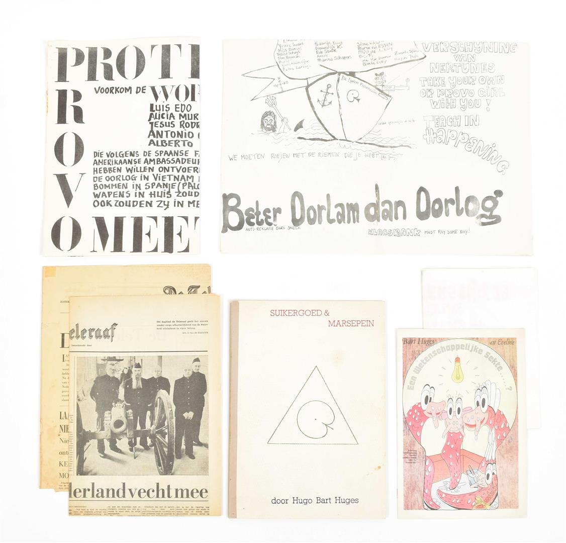 (1) Huges, B. Suikergoed & Marsepein. Amst., Atheneum Boekhandel, 1968. (2) Idem. Een wetenschappelijke sekte ….?. (3) Verkiezingsaffiche Kabouter. (4) Provo posters (2x). (5) Teleraaf (2x).