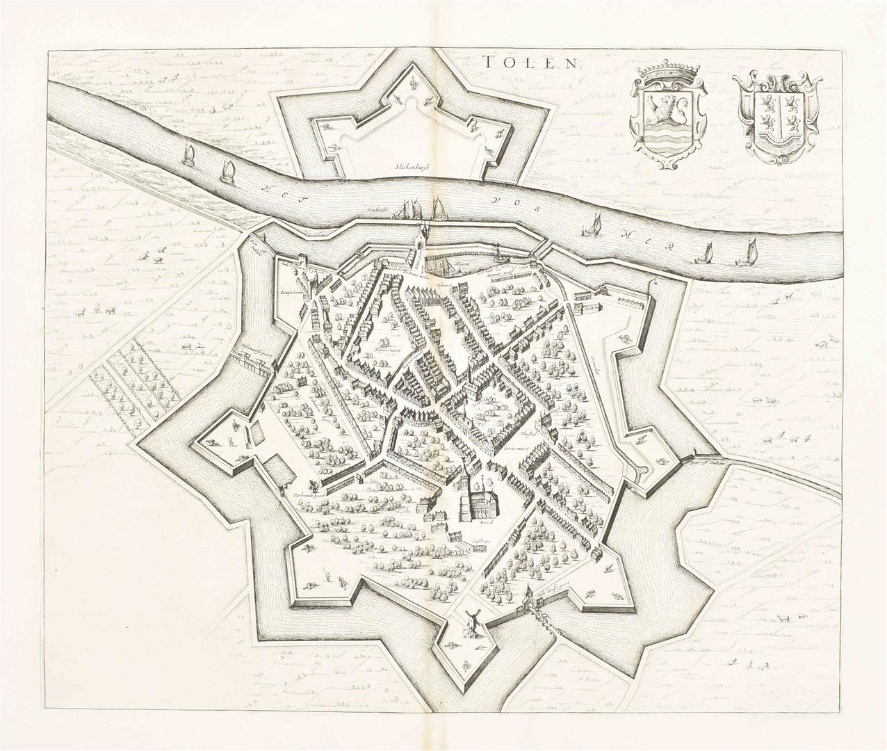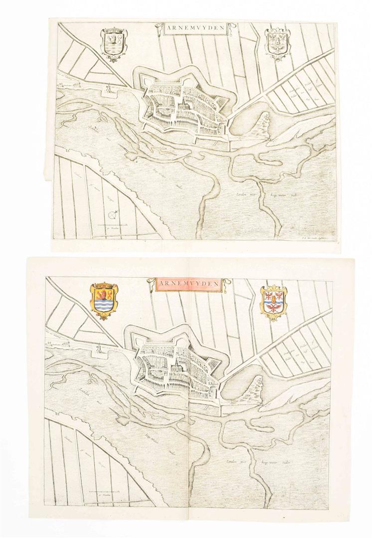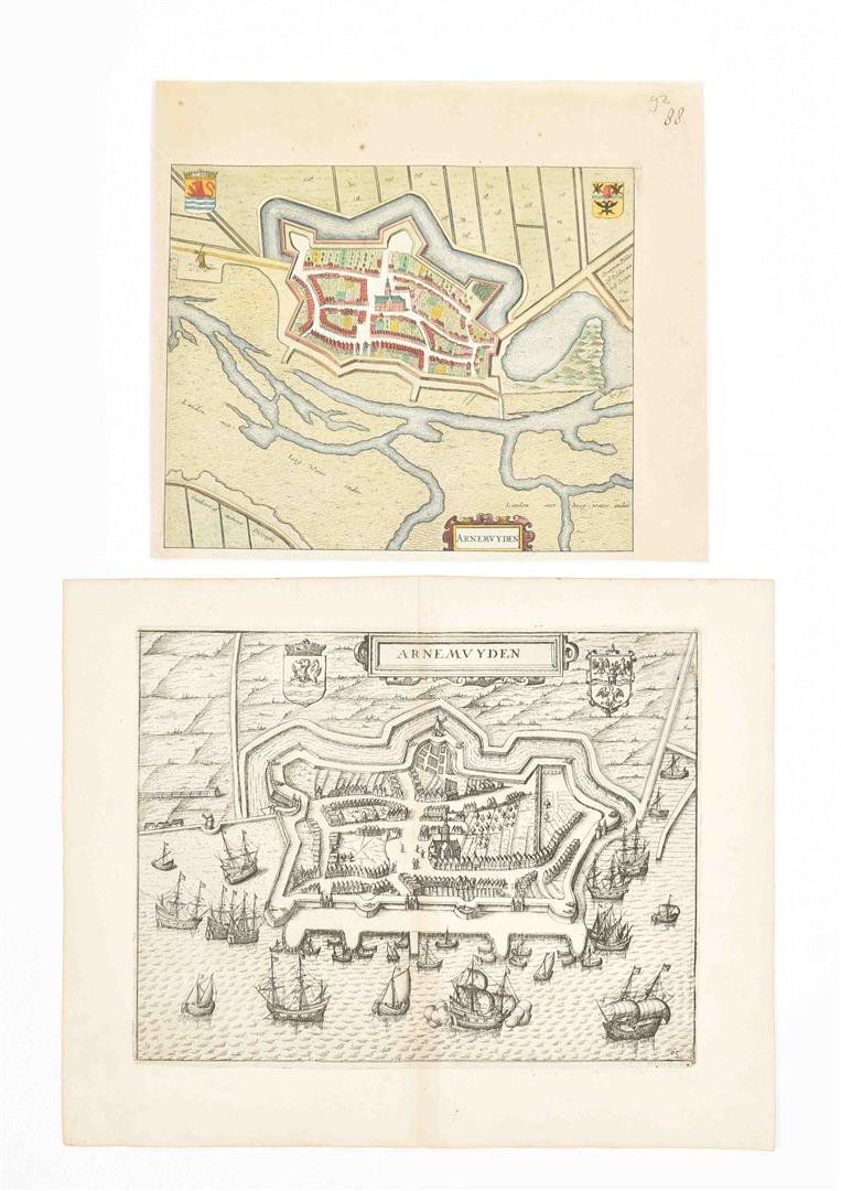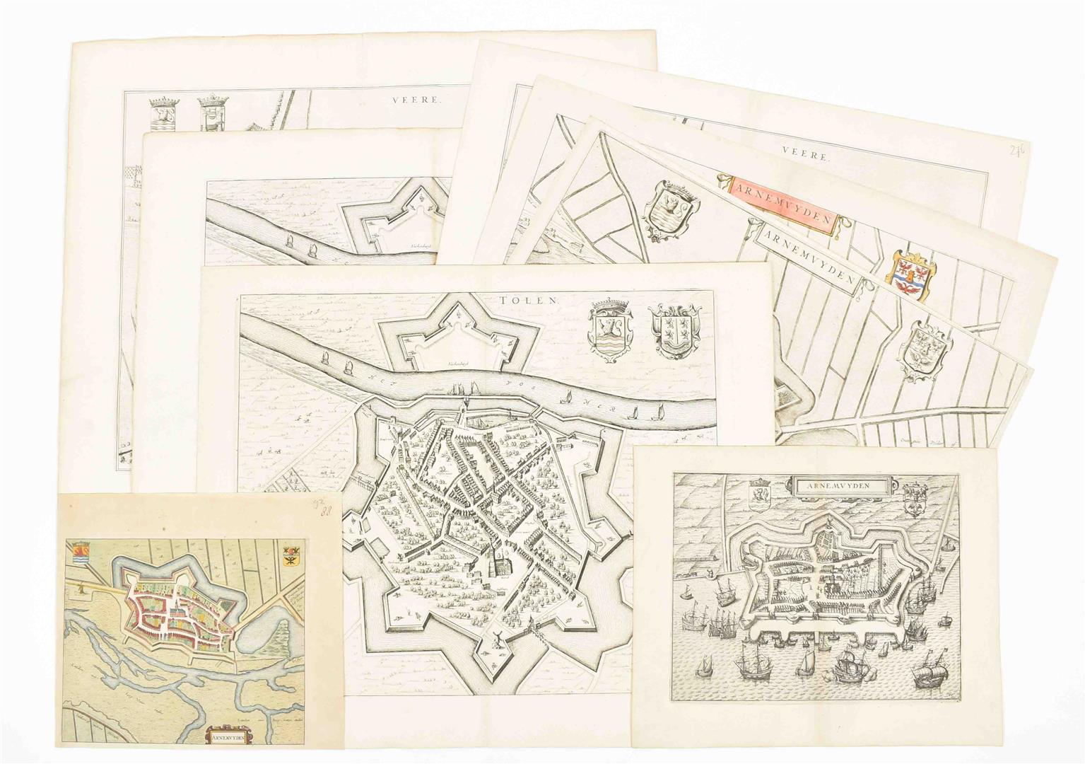 Amsterdam. 1649. W. plan and harbour of Veere w. title and coats- of-arms on top, verso resp. Latin and Dutch text. (3 and 4) Tholen. 2 folio maps. J. Blaeu from the "Stedenboek". Amsterdam. 1649 w. town plan Tholen and fortifications w. title and coat-of-arms on top, verso resp. Latin and Dutch text. (5-8) 2 folio plans Arnemuiden (Arnemuyden), 1x J. Blaeu, 1649 and 1x Leti after F. de Wit, 1690 and 2 smaller plans by Guicciardini, ca. 1620 and J. Janssonius (coloured) 1657.