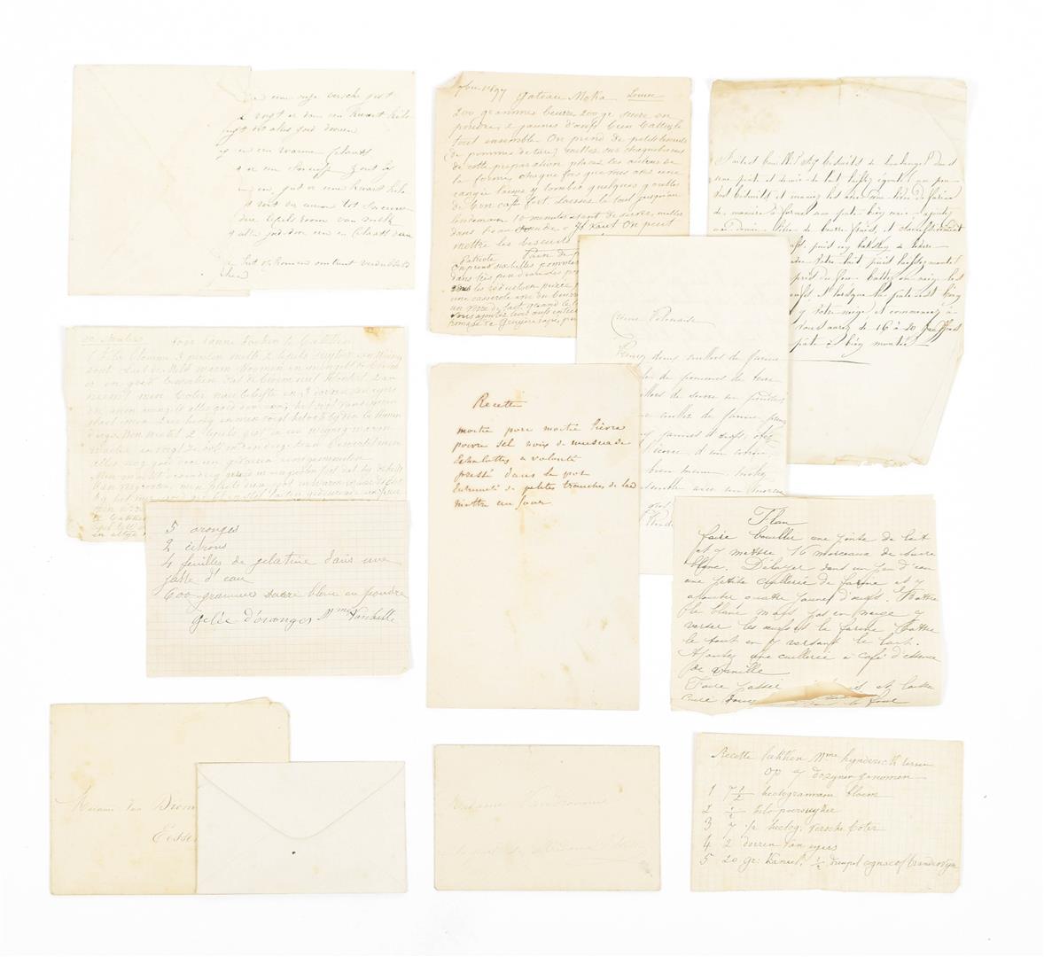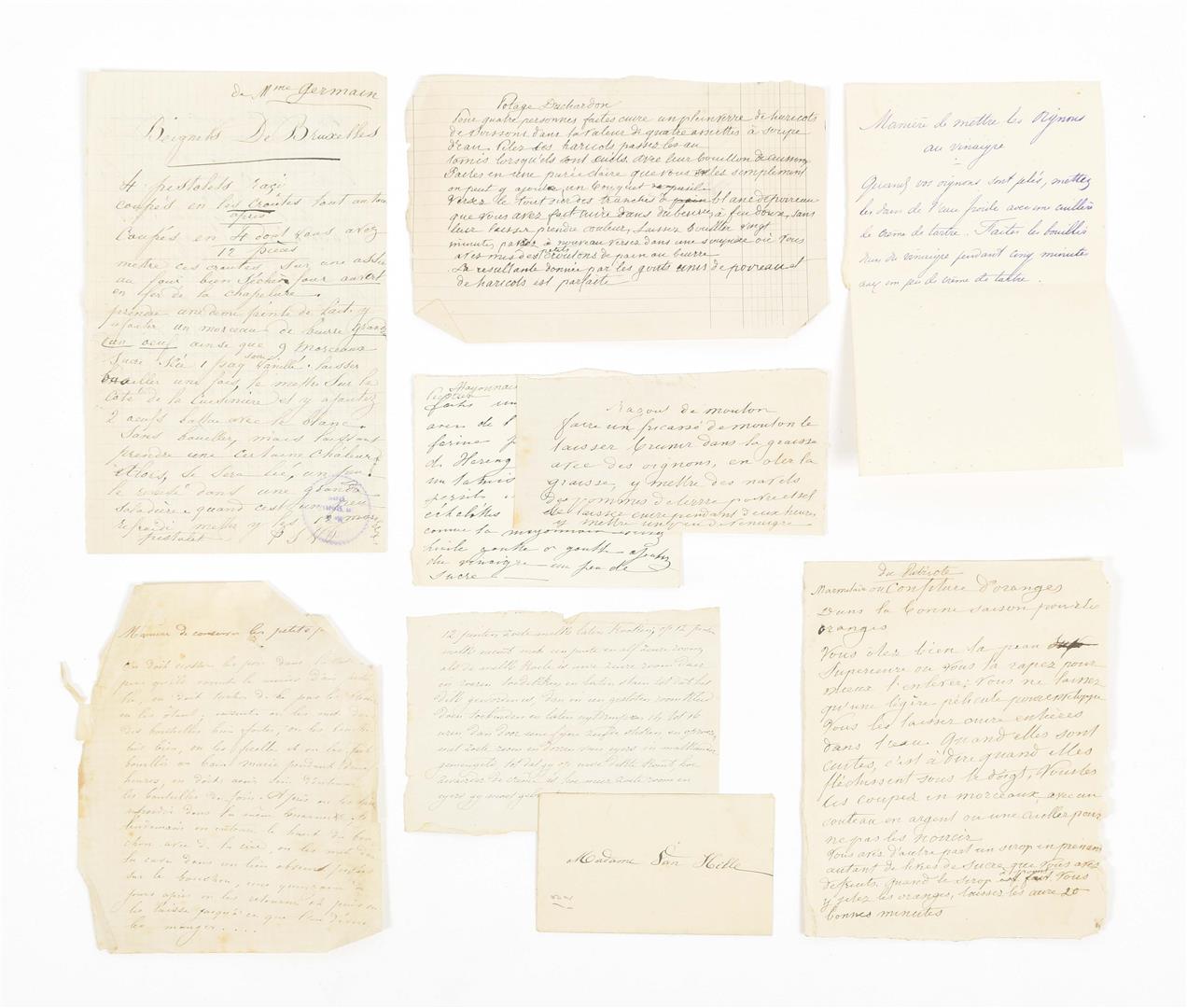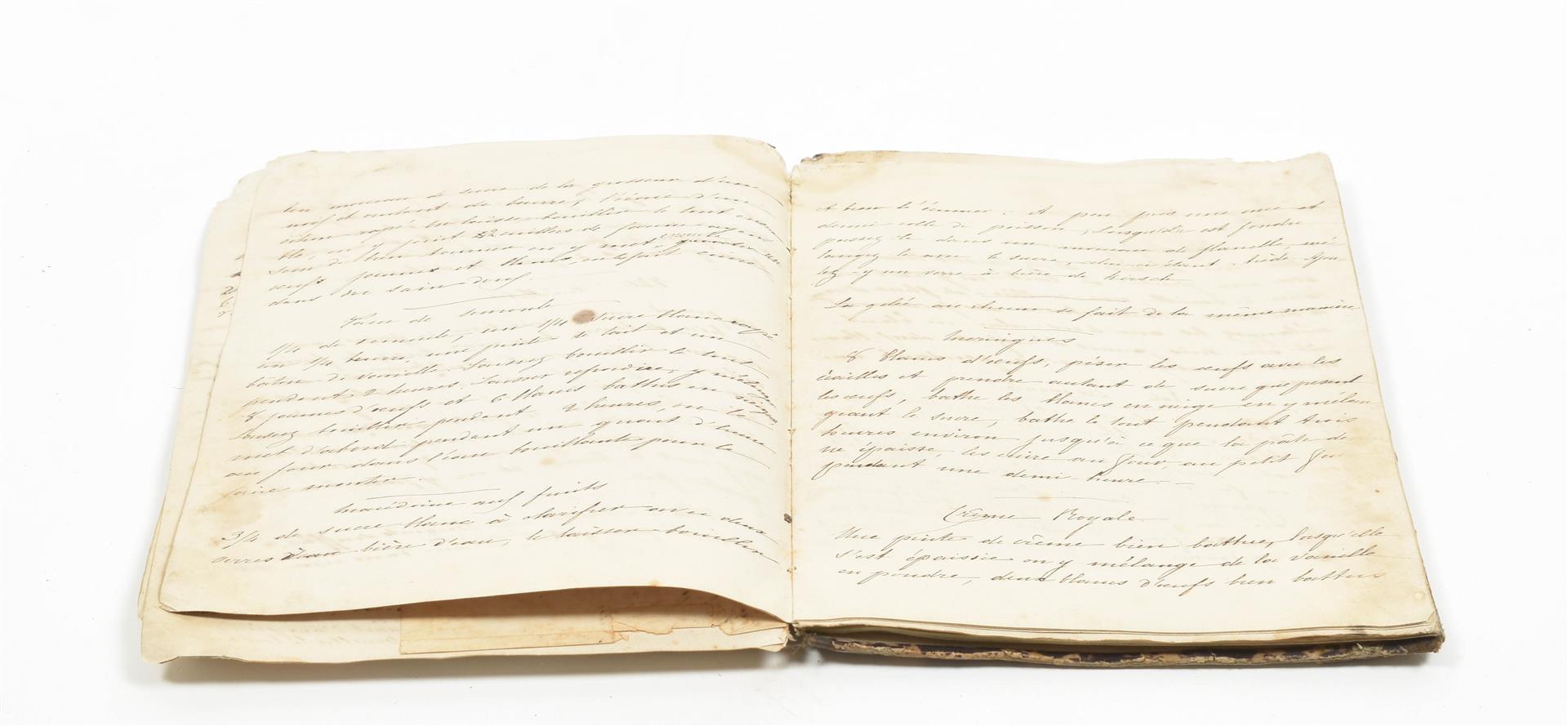 Belgium, ca. 1870-1900, text in French, approx. 60 pages (and many blank lvs.), and w. a number of loosely inserted recipes, contemp. hcl, 4to. Recipes such as "Viandes", "Pain de viande", "Cotelettes de Cherenil", "Cunbale Molinière (hotel de Flandre)", Pate pour vol au vent", "Cotelettes de mouton truffiées", "Pouding à la Reine" and "Beignets de pomme". -with approx. 50 loose recipes from the same period.