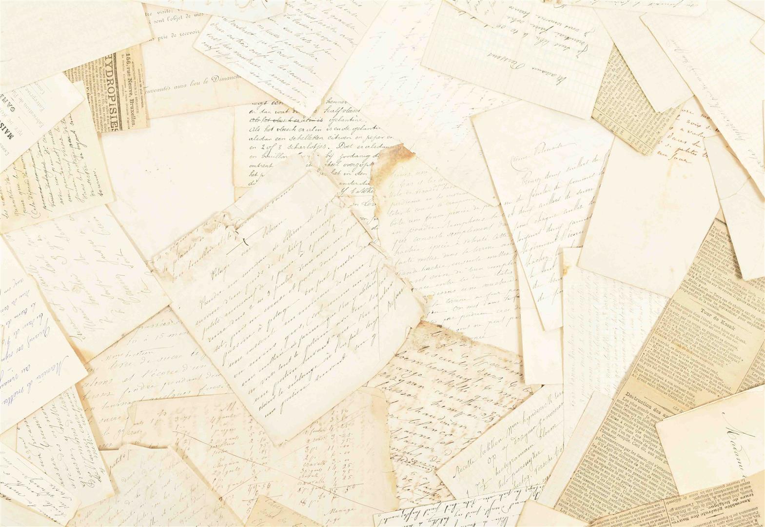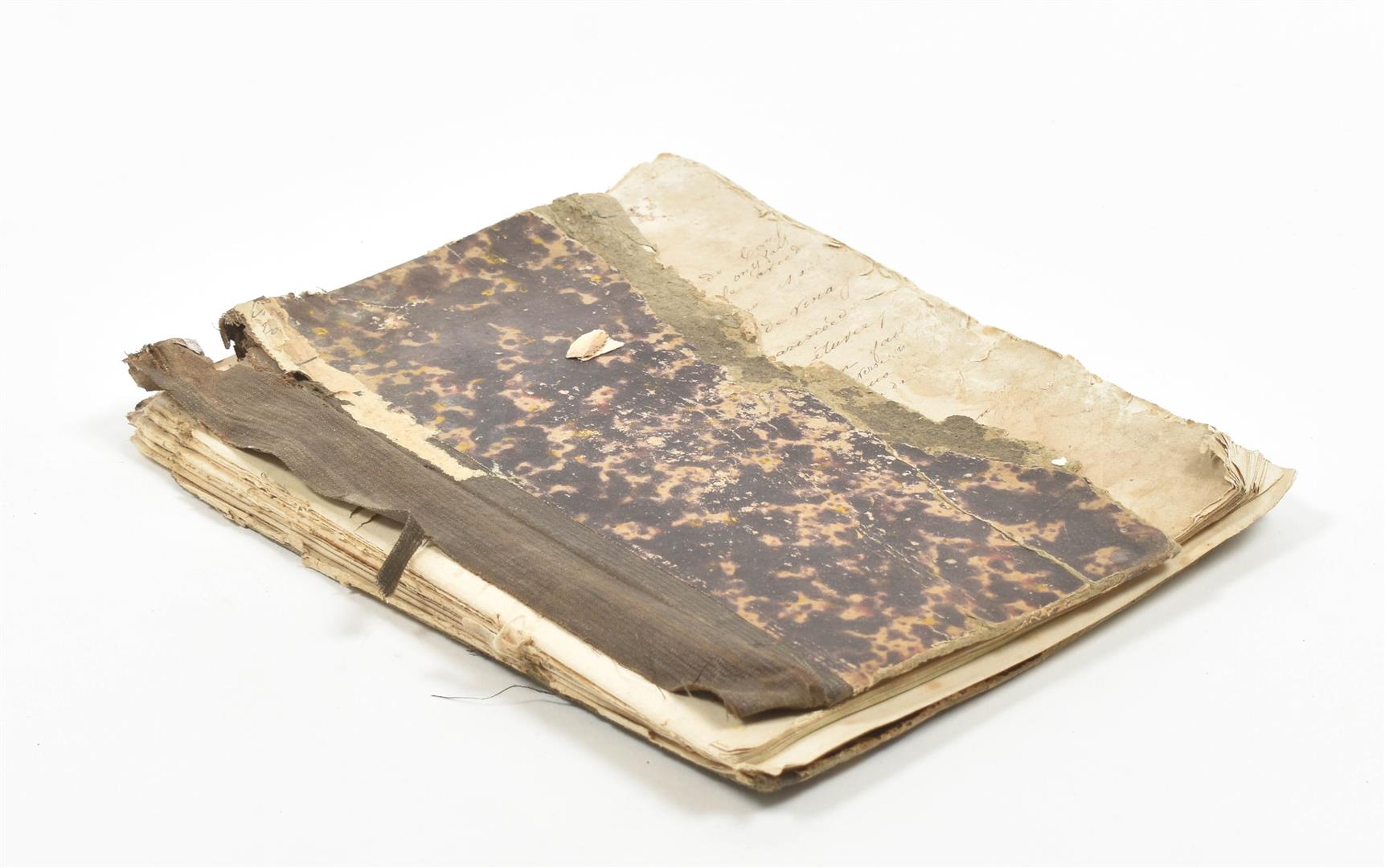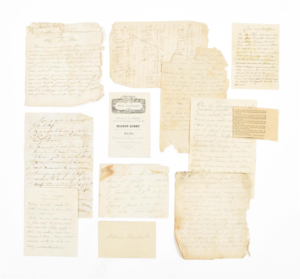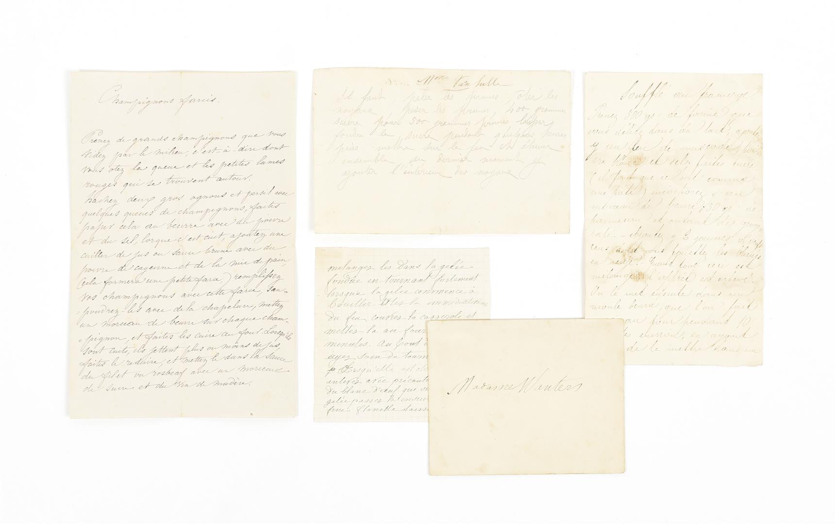 Belgium, ca. 1870-1900, text in French, approx. 60 pages (and many blank lvs.), and w. a number of loosely inserted recipes, contemp. hcl, 4to. Recipes such as "Viandes", "Pain de viande", "Cotelettes de Cherenil", "Cunbale Molinière (hotel de Flandre)", Pate pour vol au vent", "Cotelettes de mouton truffiées", "Pouding à la Reine" and "Beignets de pomme". -with approx. 50 loose recipes from the same period.