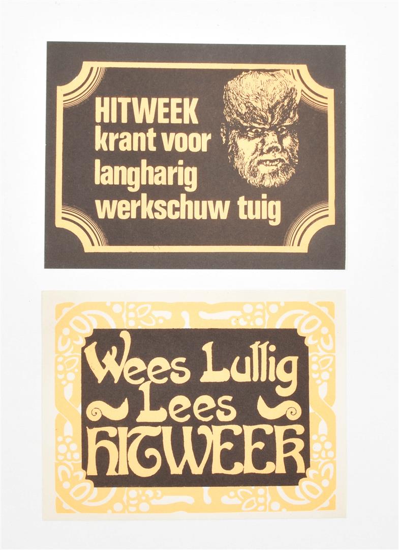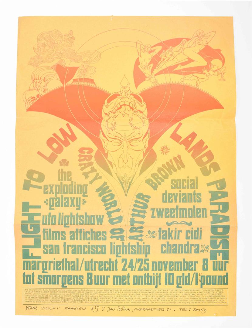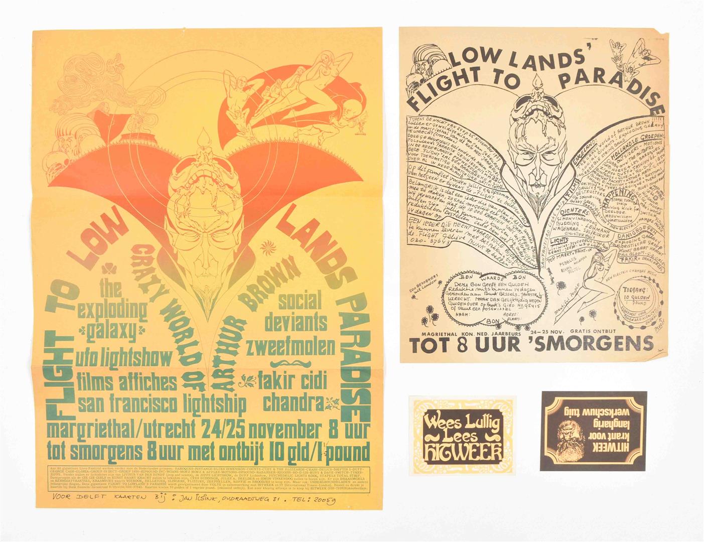 (1) Sm. festival poster for the first edition of the Dutch pop festival. 45 x 32.5 cm. Some of the acts: Crazy World of Arthur Brown, Bintangs, Group 1850, Baroques, Cuby & the Blizzards. Folded, pinholes on edges and handwritten address at the bottom for card sales in Delft. (2) Leaflet, 'Low Lands' Flight to Paradise'. 31 x 25 cm. Frayed on upper right. Added: 2 sm. flyers for Hitweek.