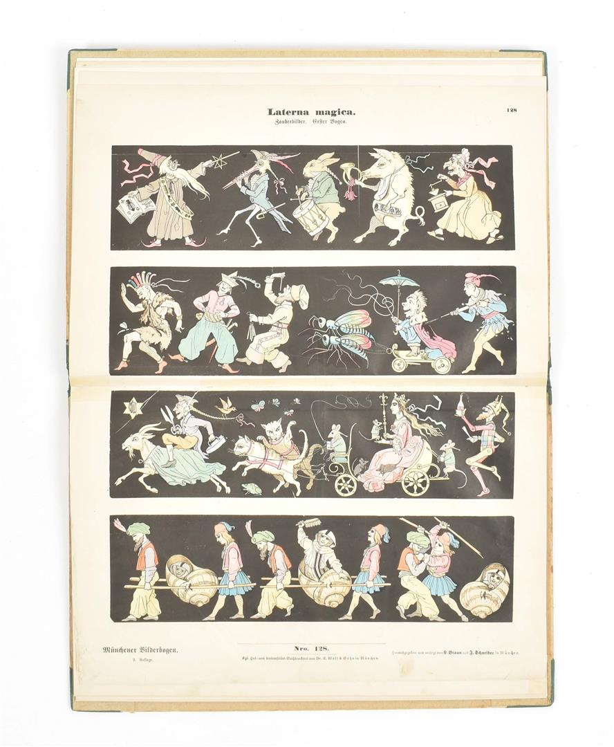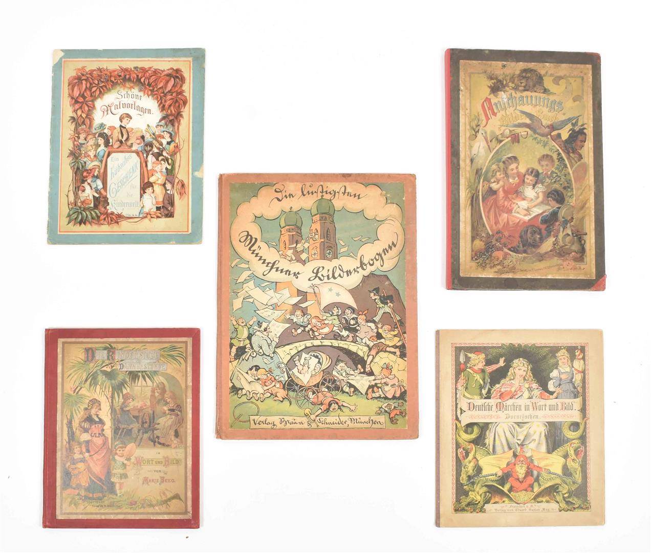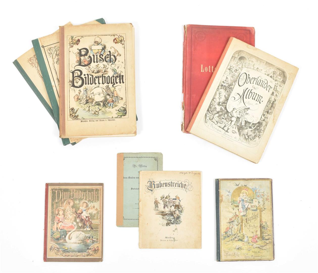 Late 19th to early 20th cent. Incl. a.o.: (1) Reiss, F. Jugendlust. Leipzig, Meissner & Buch, (ca. 1900). Pictorial boards. (2) Bubenstreiche. Munich, Braun & Schneider, (ca. 1930). Sc. (3) Four bound works of catchpenny prints: Münchener bilderbogen; Busch bilderbogen; Lotte Rohde; and Anschauungs bilderbuch. Added: One Swedish children's book, Djurbilderbok för snälla barn. Stockholm, O.L. Lamm, (1879). Cloth-backed pictorial boards.
