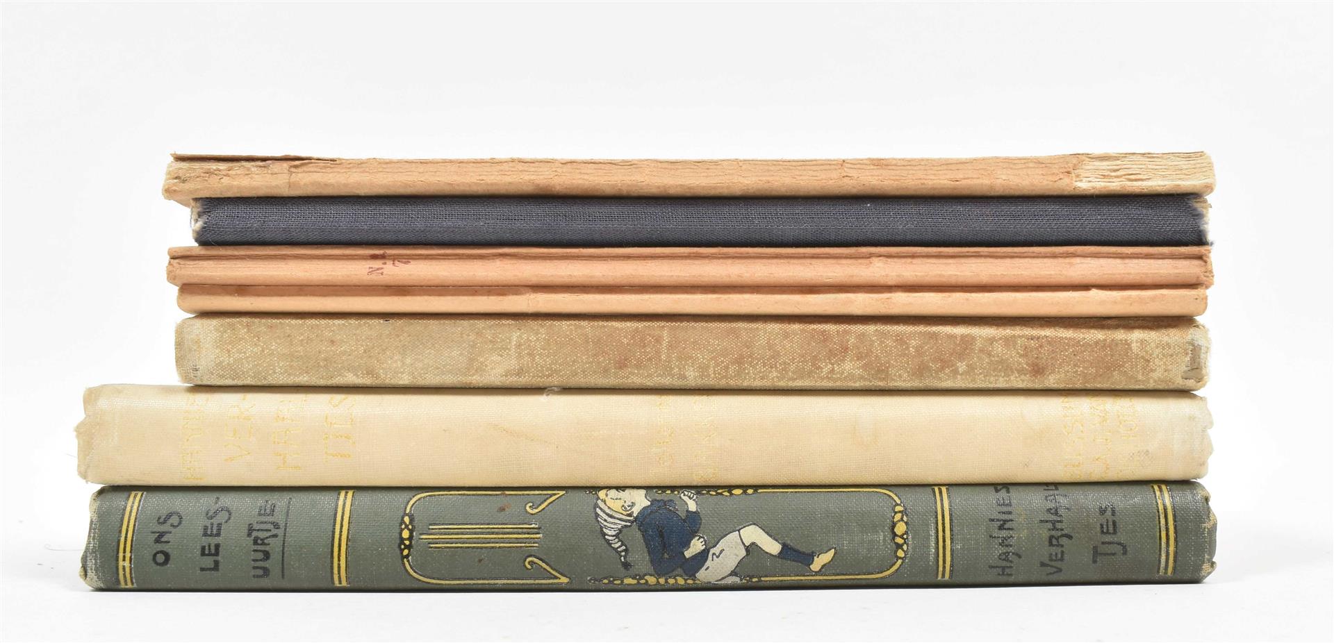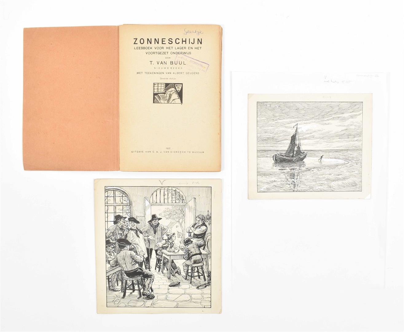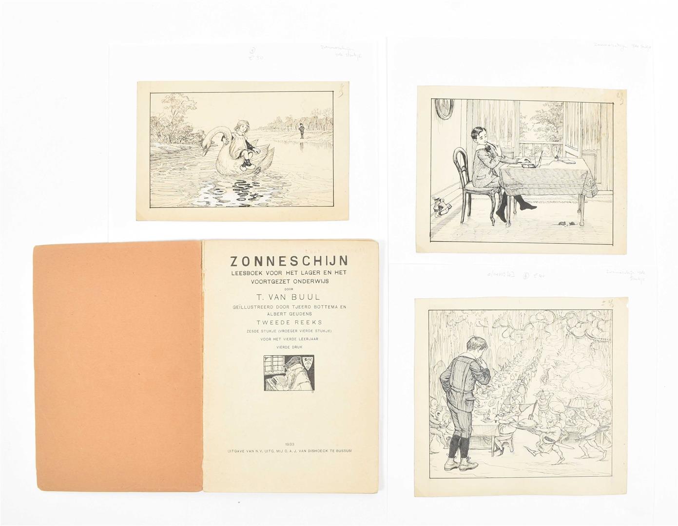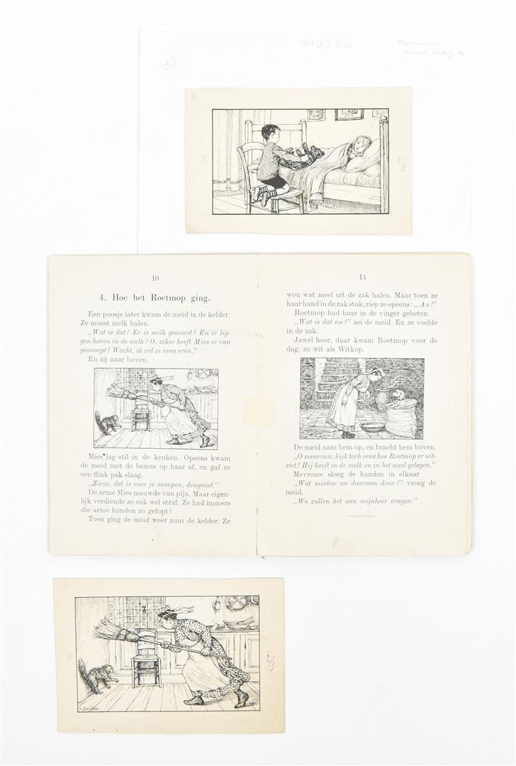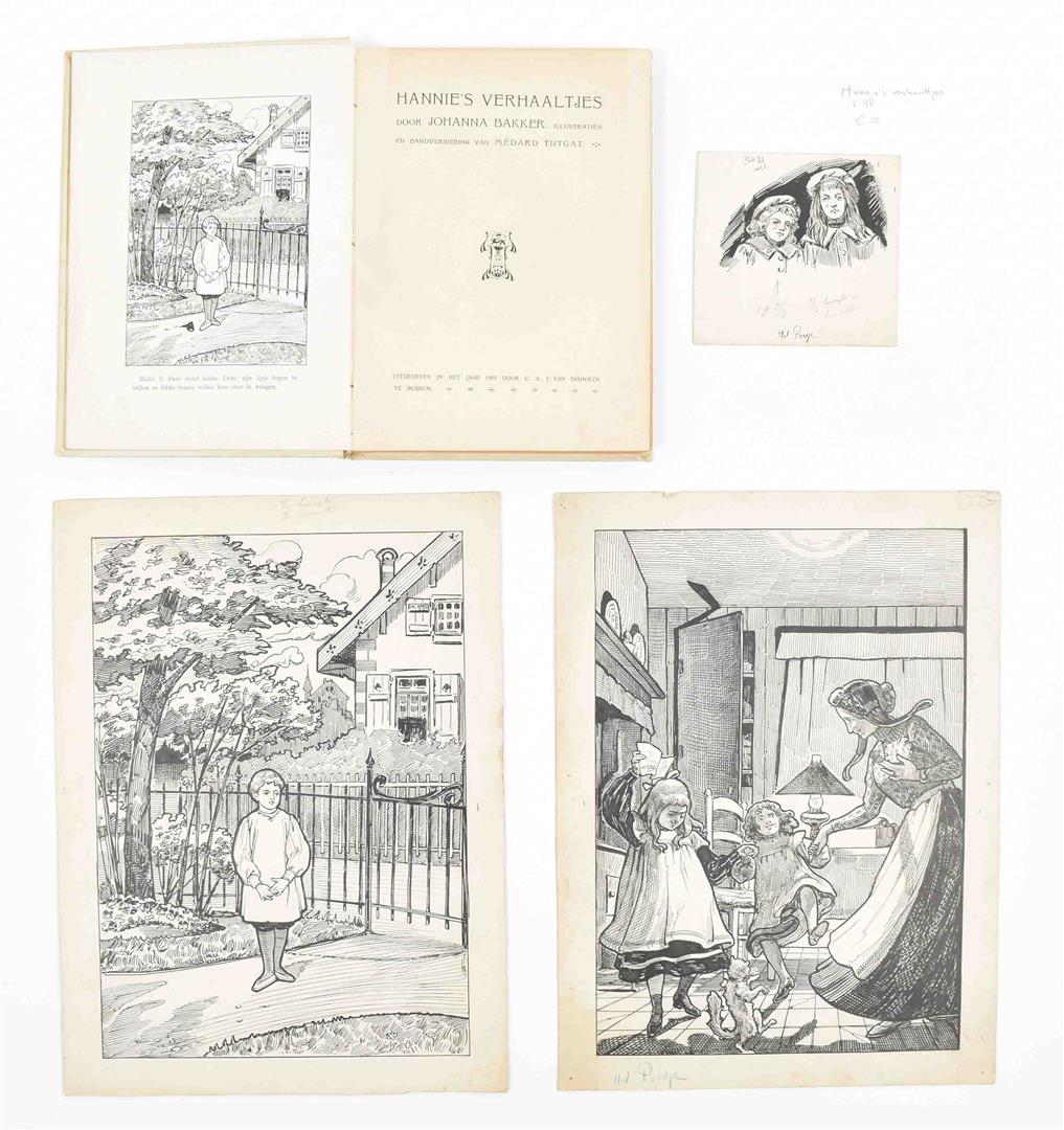 (1-3) Tytgat, M. (1871-1948). 3 orig. drawings for J. Bakker, Hannie's verhaaltjes, Bussum, C.A.J. van Dishoeck, 1903, approx. 27 x 18.5 (2x) and 6 x 9 cm, w. annotations in pencil. -and 2 copies of the book featuring the works. (4-5) Geudens, A. (1869-1949). 2 orig. drawings for var. eds. of T. van Buul, Zonneschijn (...), ibid., idem, 1936, 7.5 x 12 and 7 x 11 cm, w. annotations in pencil verso. -and a copy of the work featuring the drawings. -and 12 similar orig. drawings by Geudens (some w. printed ed. of the works featuring the drawings).
