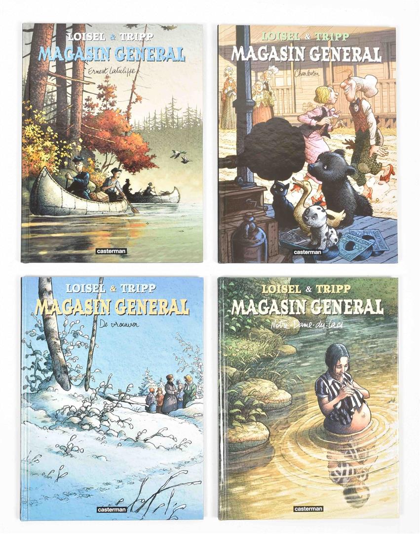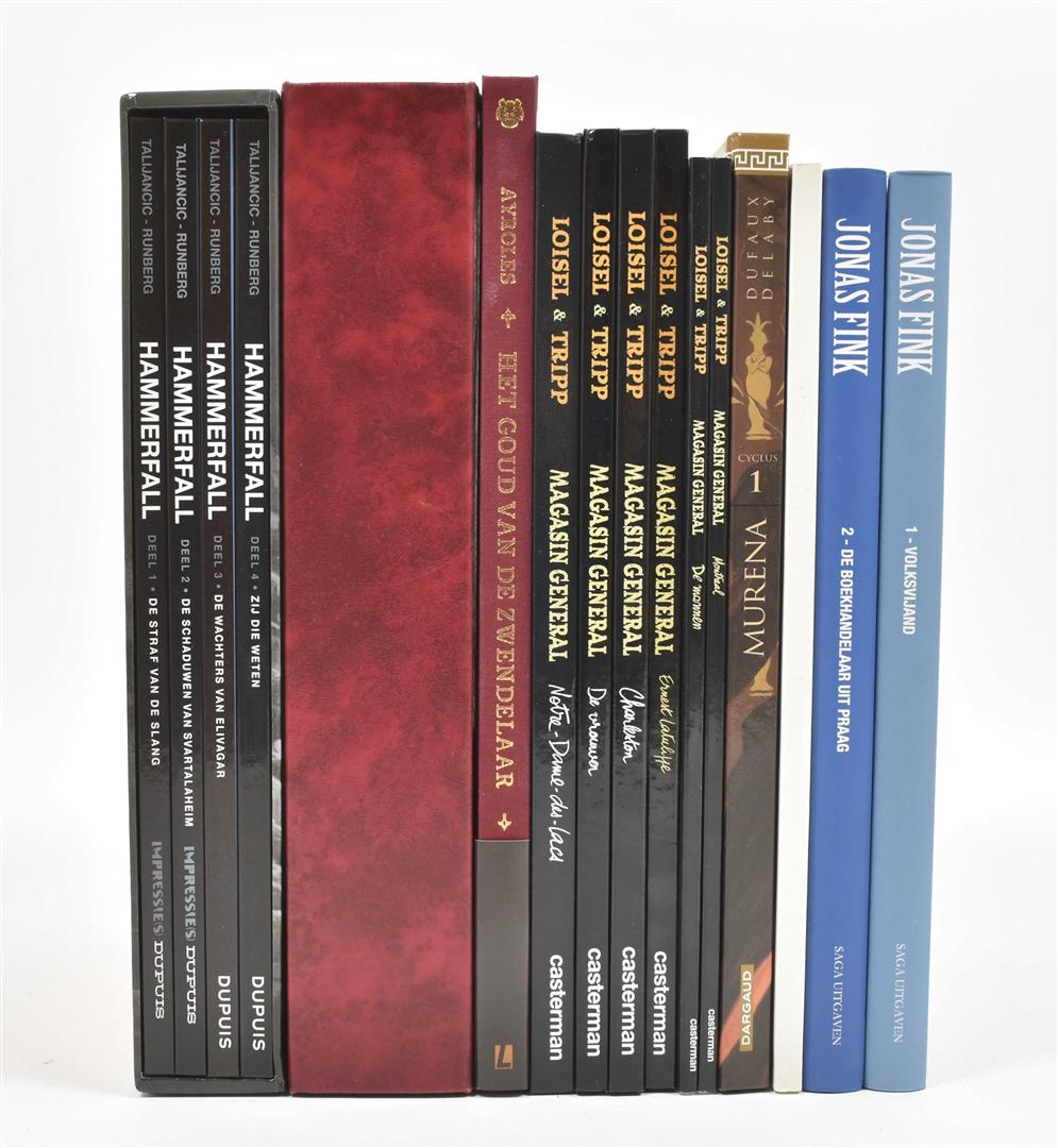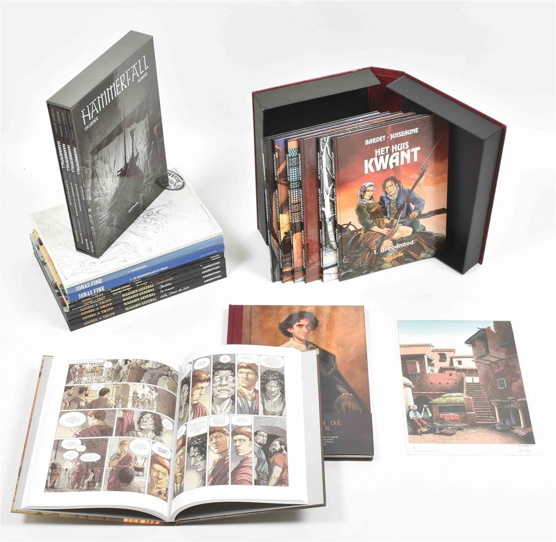 (1) Hammerfall. Dupuis, 2010. Nos. 1-4. Hc in slipcase. (2) Het Huis Kwant. Orange, 1991. Nos. 1-6. Incl. ex libris signed and numb. 286/350 in pencil by Jusseaume. Hc in clamshell box. (3) Magasin General. Casterman, 2000s. 6 var. issues. Hc (4x) & sc (2x). Added: (4) Het goud van de zwendelaar. Uitgeverij L, 2019. Incl. ex libris, numb. 329/400 and signed in pencil by both Ayroles & Guarnido. Hc w. belly band. (5) Jonas Fink. Saga, 2018. Vols. 1-2. Hc. -and 2 others.