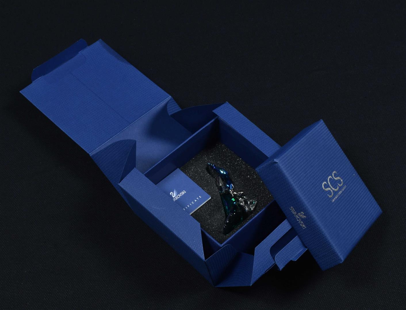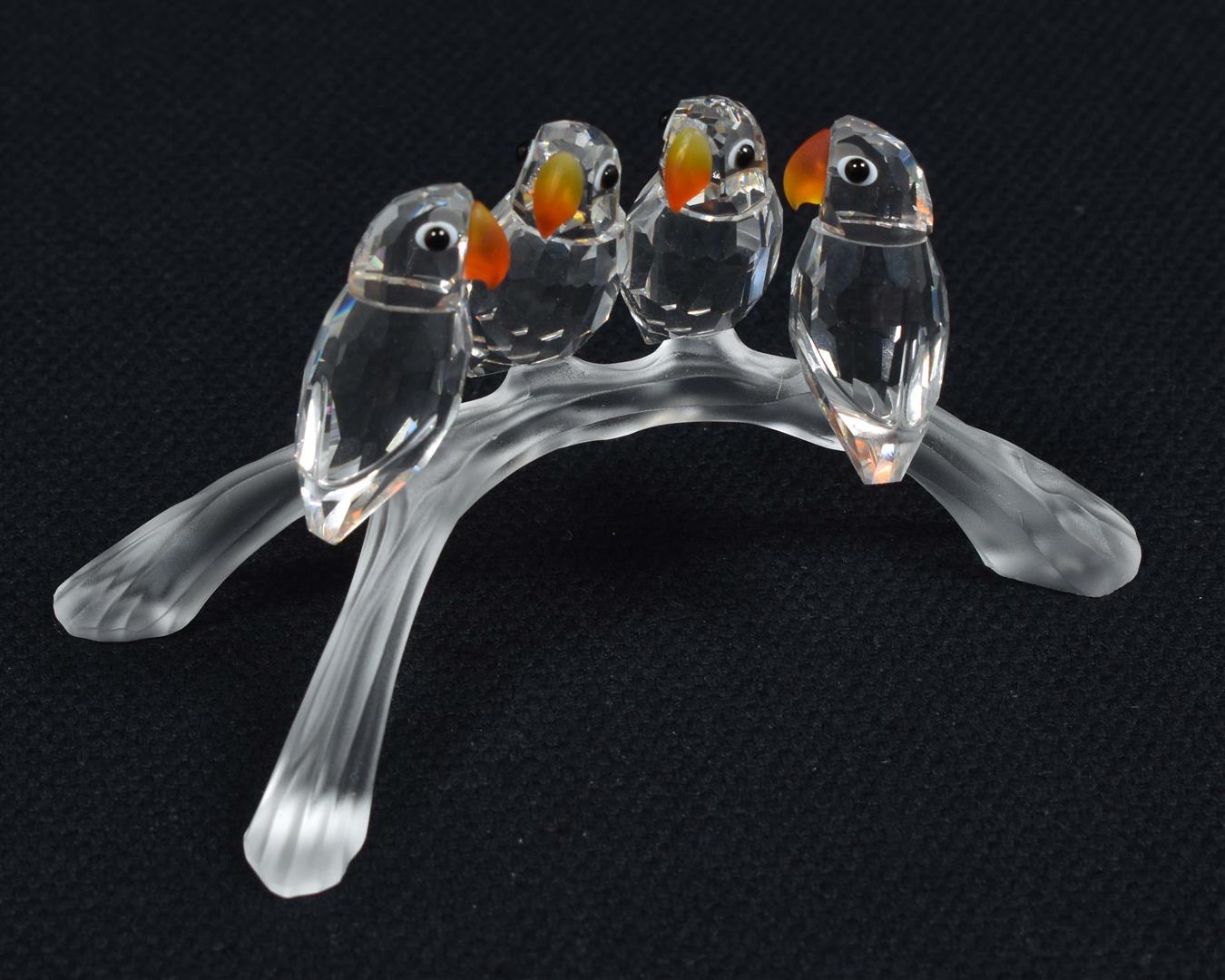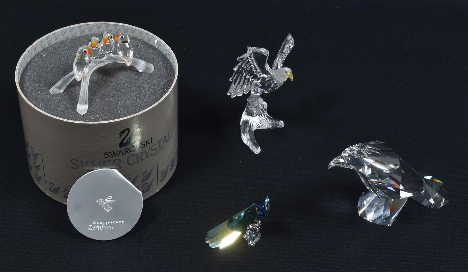 2013 figurine only available to SCS members. Des. by E. Adamer. Approx. 9 cm tall. Swarovski no. 1142861. Like new, in orig. box w. (sl. stained) outer cardboard cover, foam inserts and certificate of authenticity. Added: 3 other Swarovski bird figurines, all in orig. boxes.
