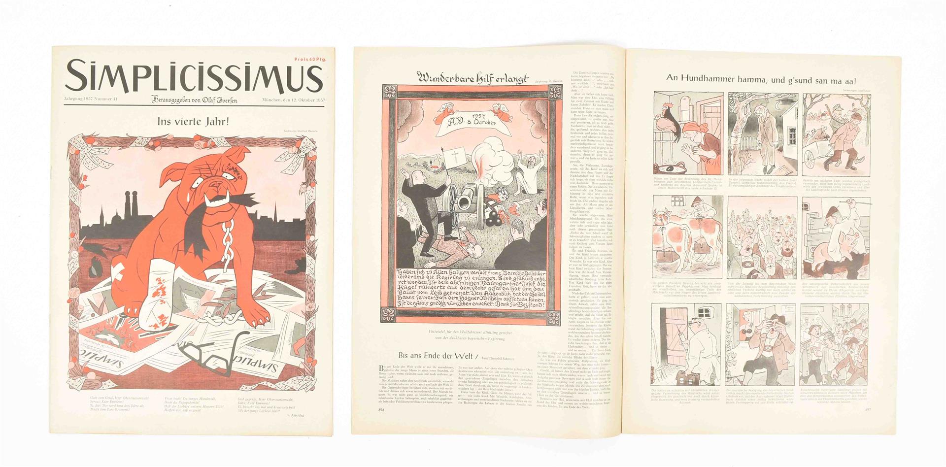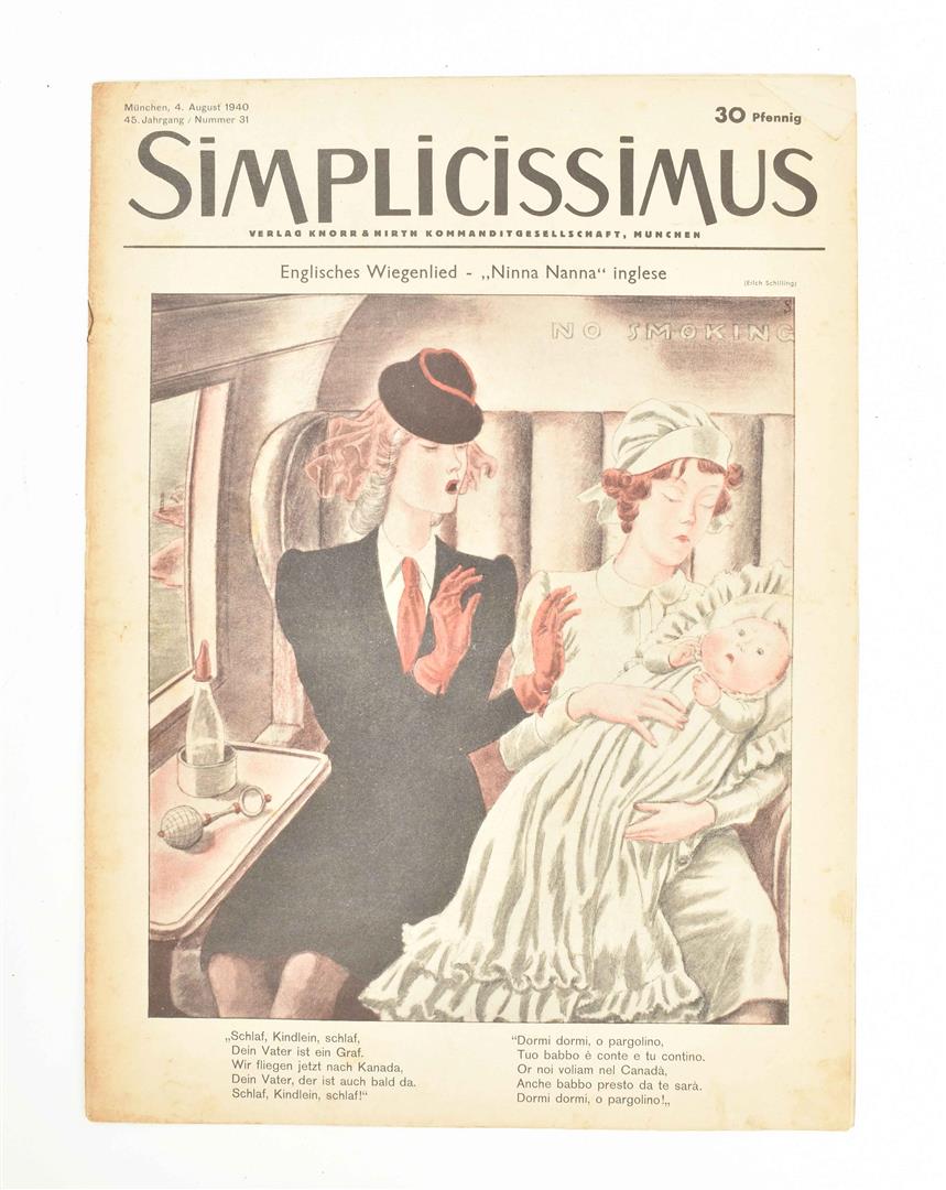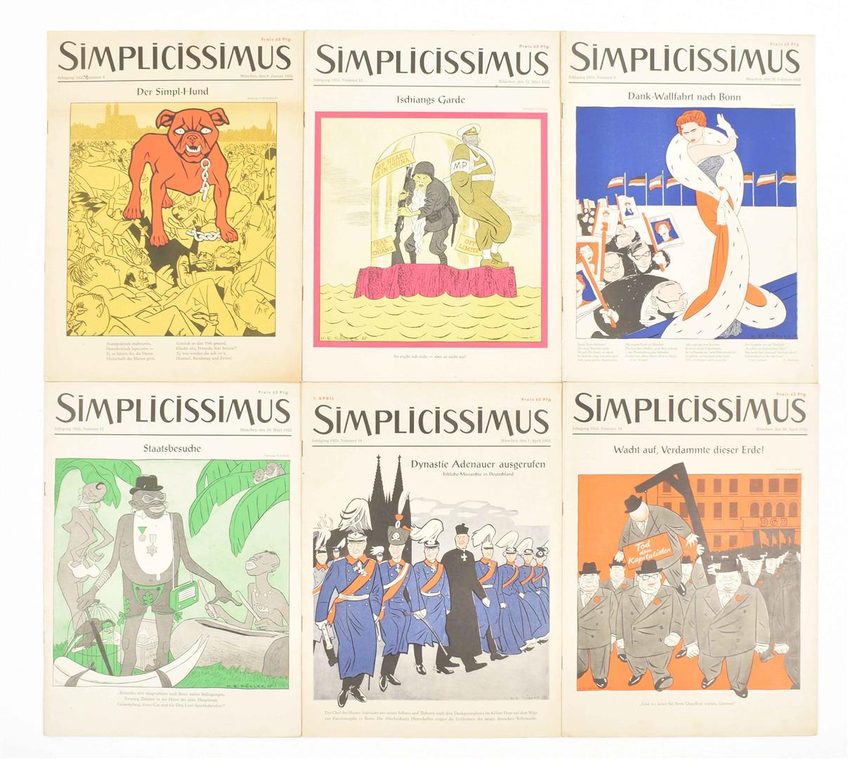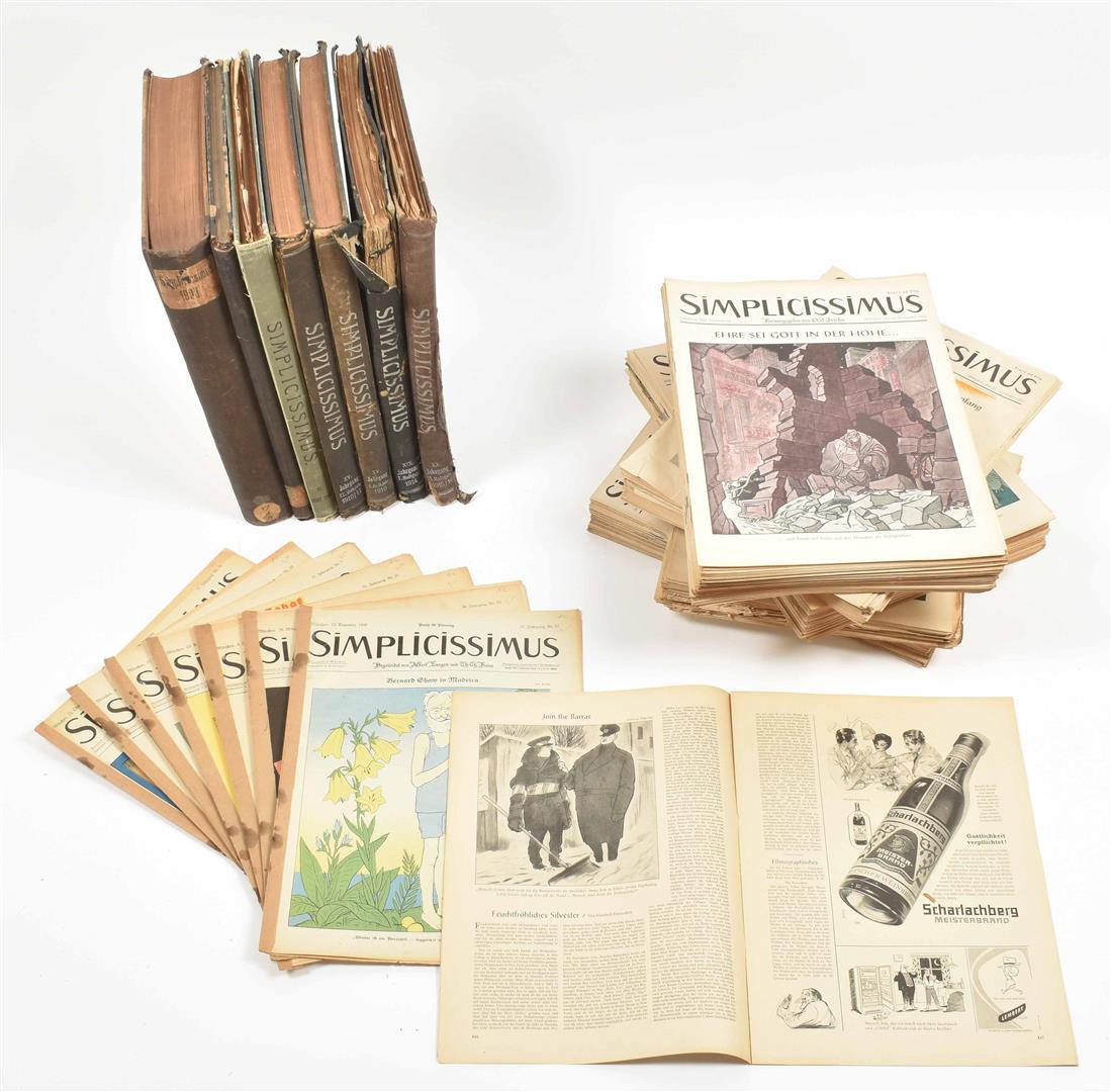 Regular signs of age and wear. Not entirely collated. Simplicissimus was a satirical German weekly magazine headquartered in Munich that ran from 1896-1967. Some covers feature anti-American, anti-British or anti-Bolshevik propaganda. (total approx. 157)