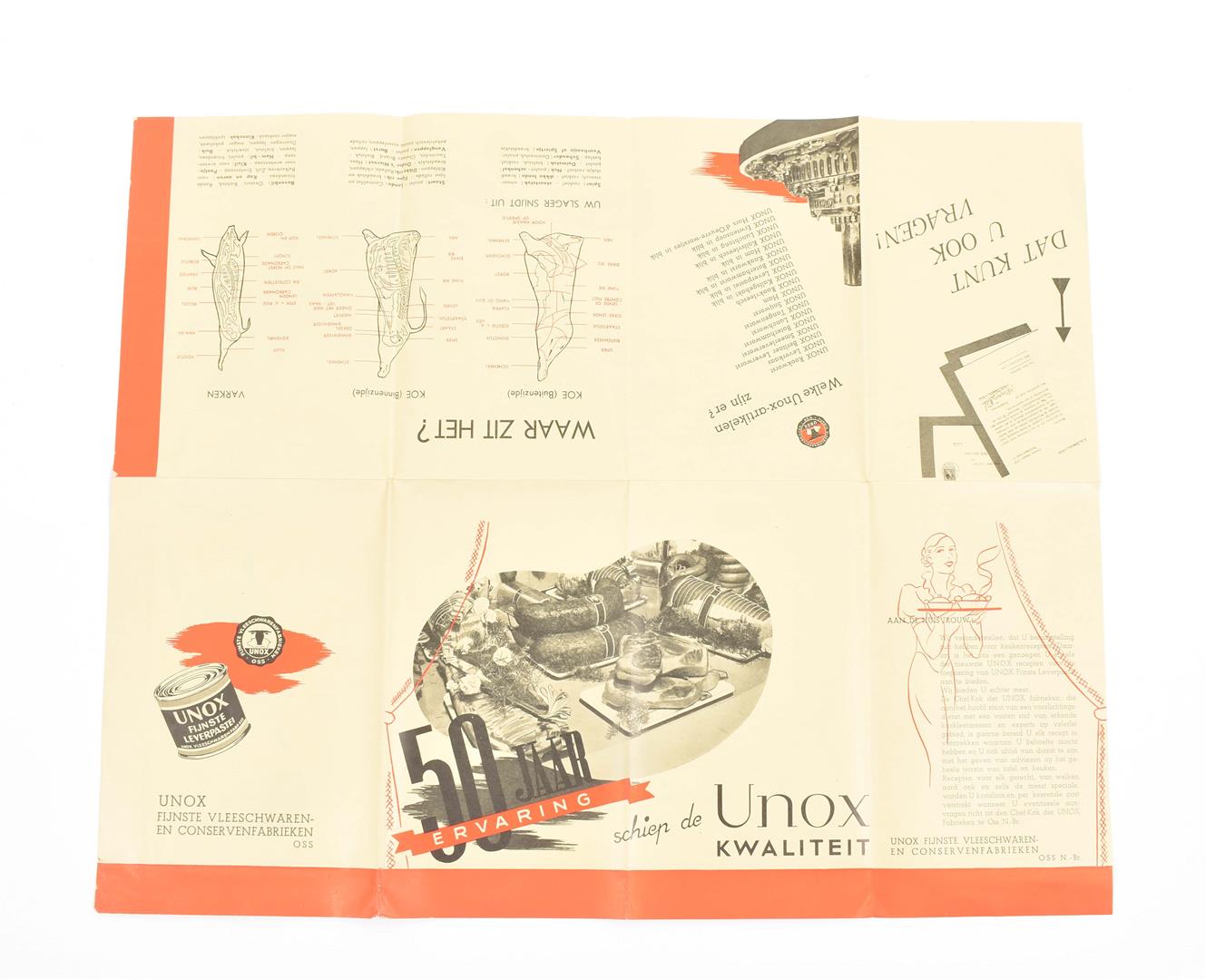 Early to late 20th cent. Incl. a.o.: (1) Albert Heijn Christmas food advertorial pamphlet, ca. 1930. (2) Unox. Fold. pamphlet of recipes, ca. 1938. (3) Prijscourant van de Pulp-, Jam- en Conservenfabriek, Vruchten- en Groentendrogerij, 1906. (4) Handels Maizena Merk, recipe pamphlet. (5) Le plant de pomme de terre néerlandaise. Commission pour la Propagande des plantes de pomme de terre pour l'étranger, 1947. Propaganda booklet promoting the planting and eating of potatoes in post-WWII Europe.