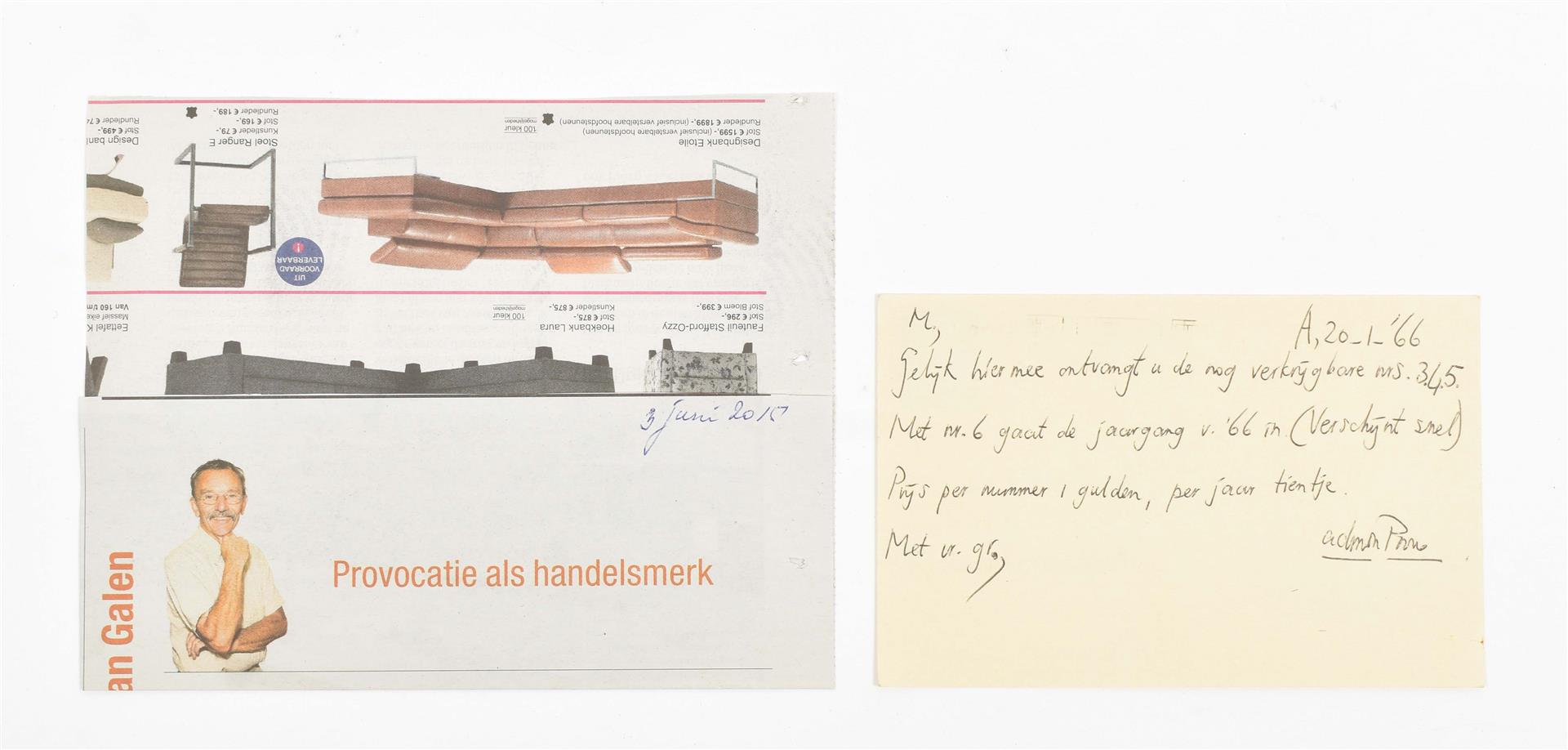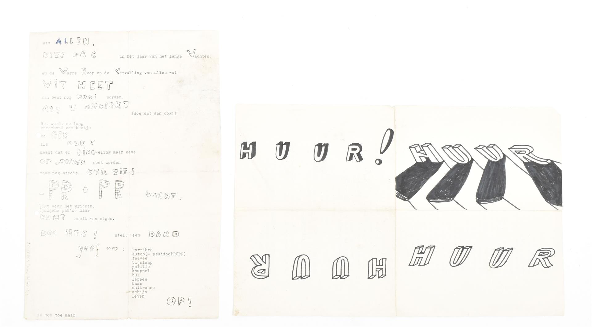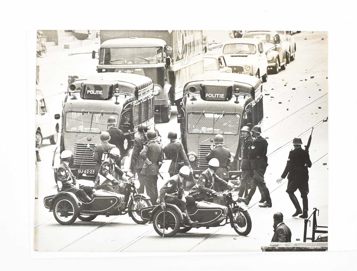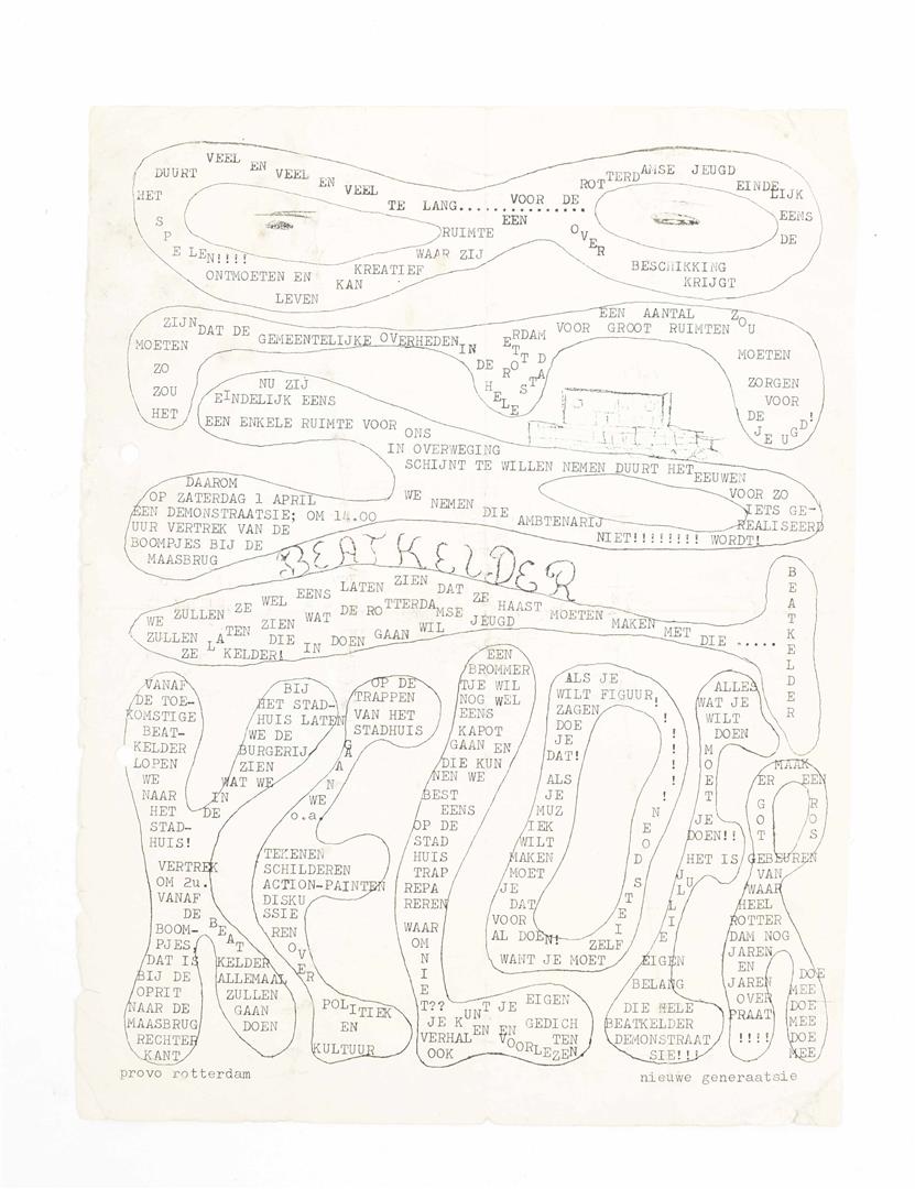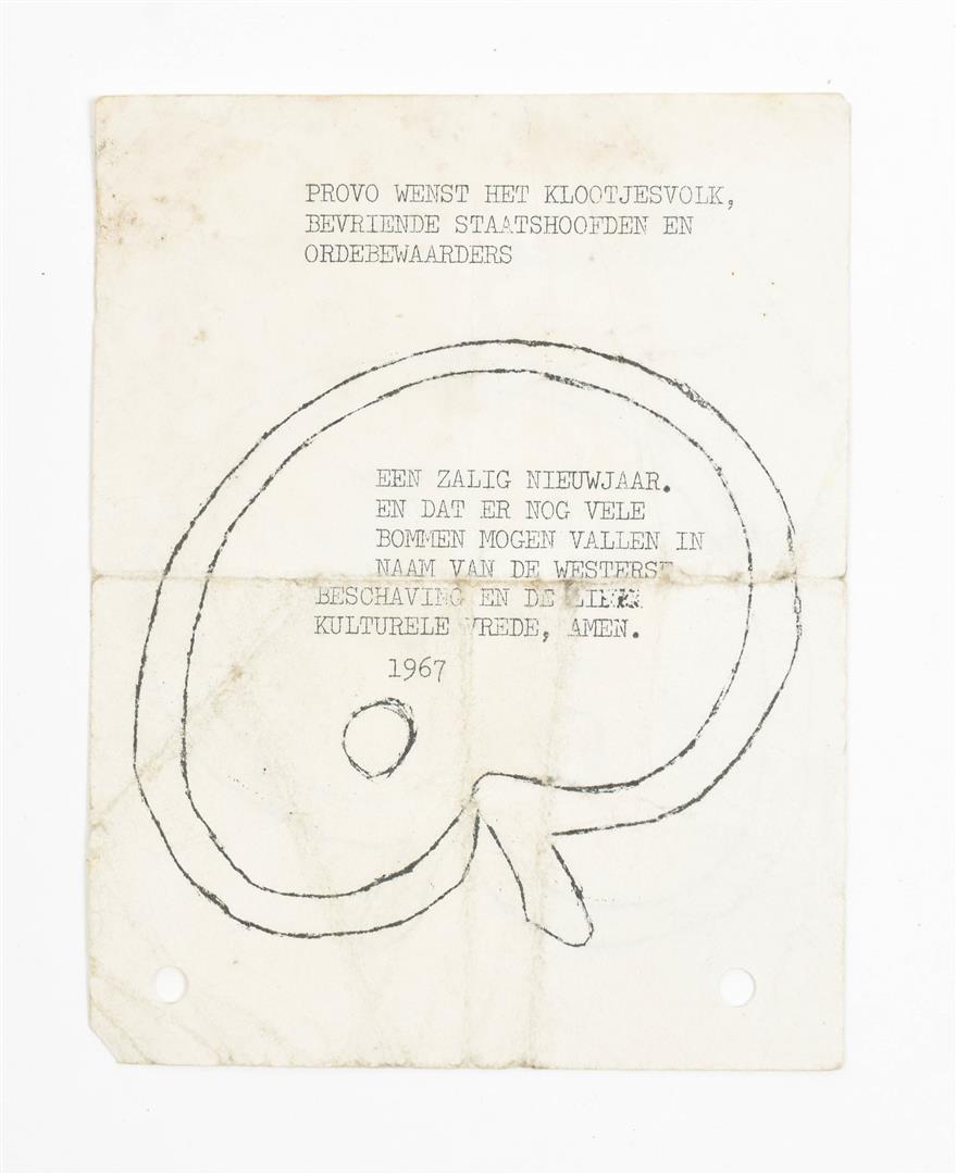 Incl. a.o.: (1) Aan allen Deze dag in het jaar van het lange Wachten en de Warme Hoop op de Vervulling van alles wat wit heet kan nog best mooi worden als u meewerkt (doe dat dan ook!) (...) Doe iets! stel: een daad (...) dit is een (...) pamphlet, ja toe maar. Stencilled pamphlet, n.d., 29.5 x 20 cm. W. moulded spot, folded and perforated. (2) Provo Rotterdam nieuwe generaatsie. Het duurt veel en veel en veel te lang... voor de Rotterdamse jeugd eindelijk eens over een ruimte de beschikking krijgt waar zij kreatief kan spelen!!!! ontmoeten en leven (...). Daarom op zaterdag 1 april een demonstraatsie (...) dat ze haast moeten maken met die beatkelder. Stencilled pamphlet, n.d., 27.5 x 20.5. The same defects as the preceding. The typescript text is not in regular order, but irregularly placed within a larger letter forming the word "beatkelder". (3) "Provo wenst het klootjesvolk, bevriende staatshoofden en orde bewaarders een zalig nieuwjaar (...)". 1967. Sm. stencilled pamphlet, 13.8 x 10.6, the text partly in a provo logo. Folded, perforated and creased. -and approx. 30 others, mainly newspaper clippings, but also incl. a poster "Oproep tot permanente revolutie, destruktie is konstruktie" (1967, w. defects), an orig. "Dagvaarding van verdachte" (for disturbing behaviour at a demonstration, 1967) and a few related photogr.
