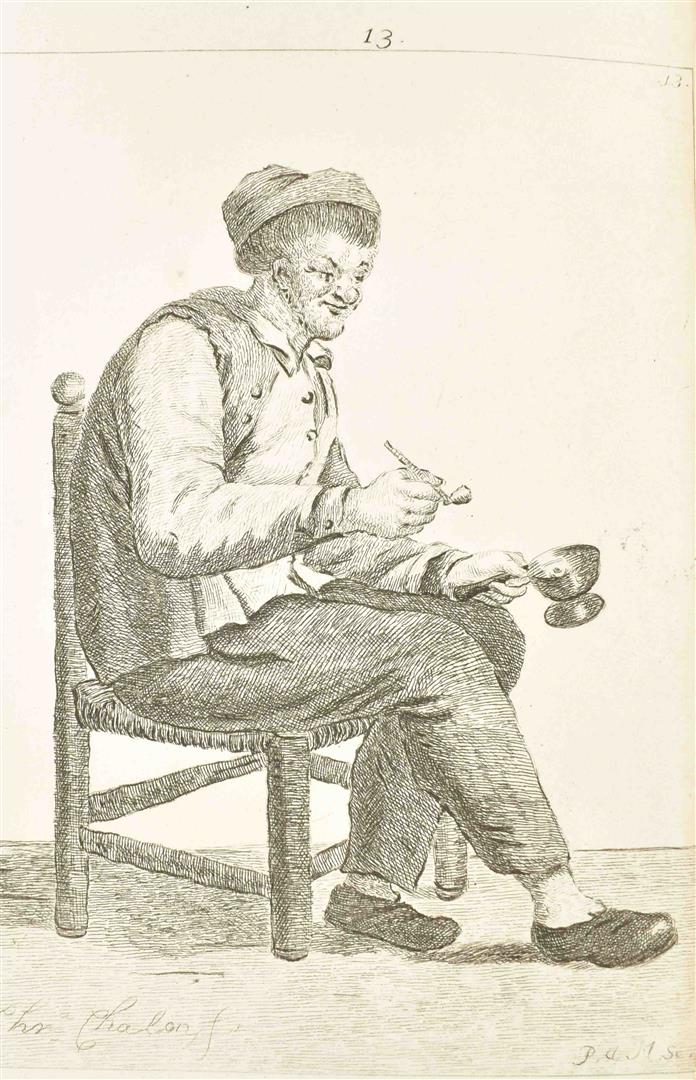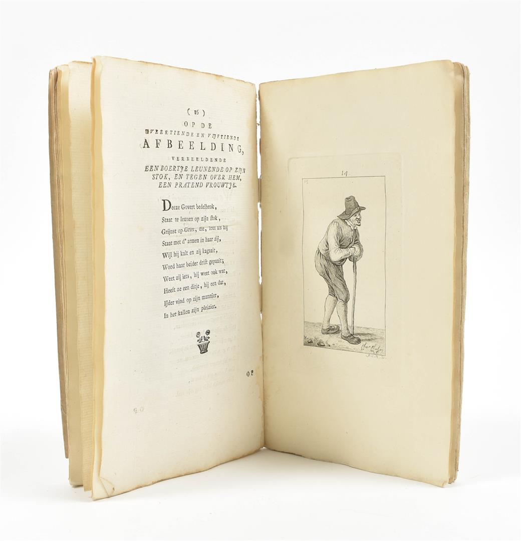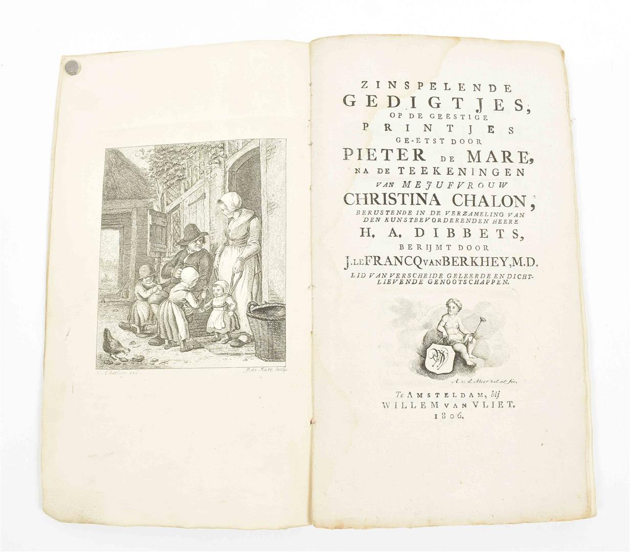 op de geestige printjes ge-etst door Pieter de Mare, na de teekeningen van Mejuffrouw Christina Chalon, berustende in de verzameling van den kunstbevorderenden heere H.A. Dibbets, berijmt door J. Le Francq van Berkhey, M.D. (...). Amst., W. van Vliet, 1806, 28,(4) p., 32 etched ills. on 26 plates, contemp. marbled paper boards.