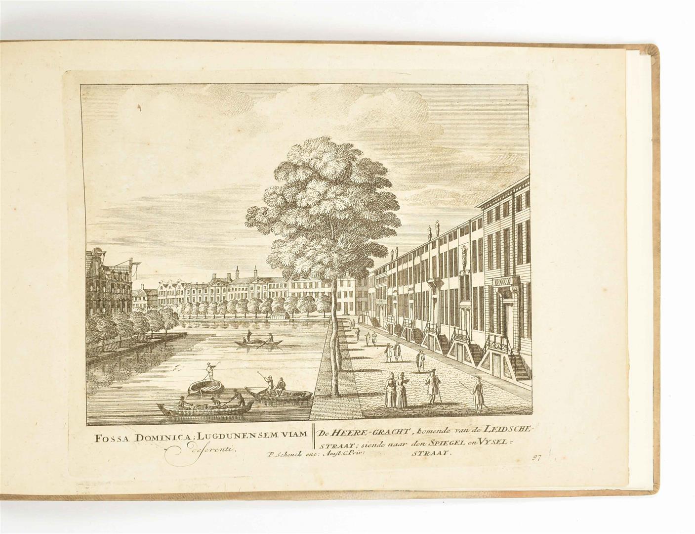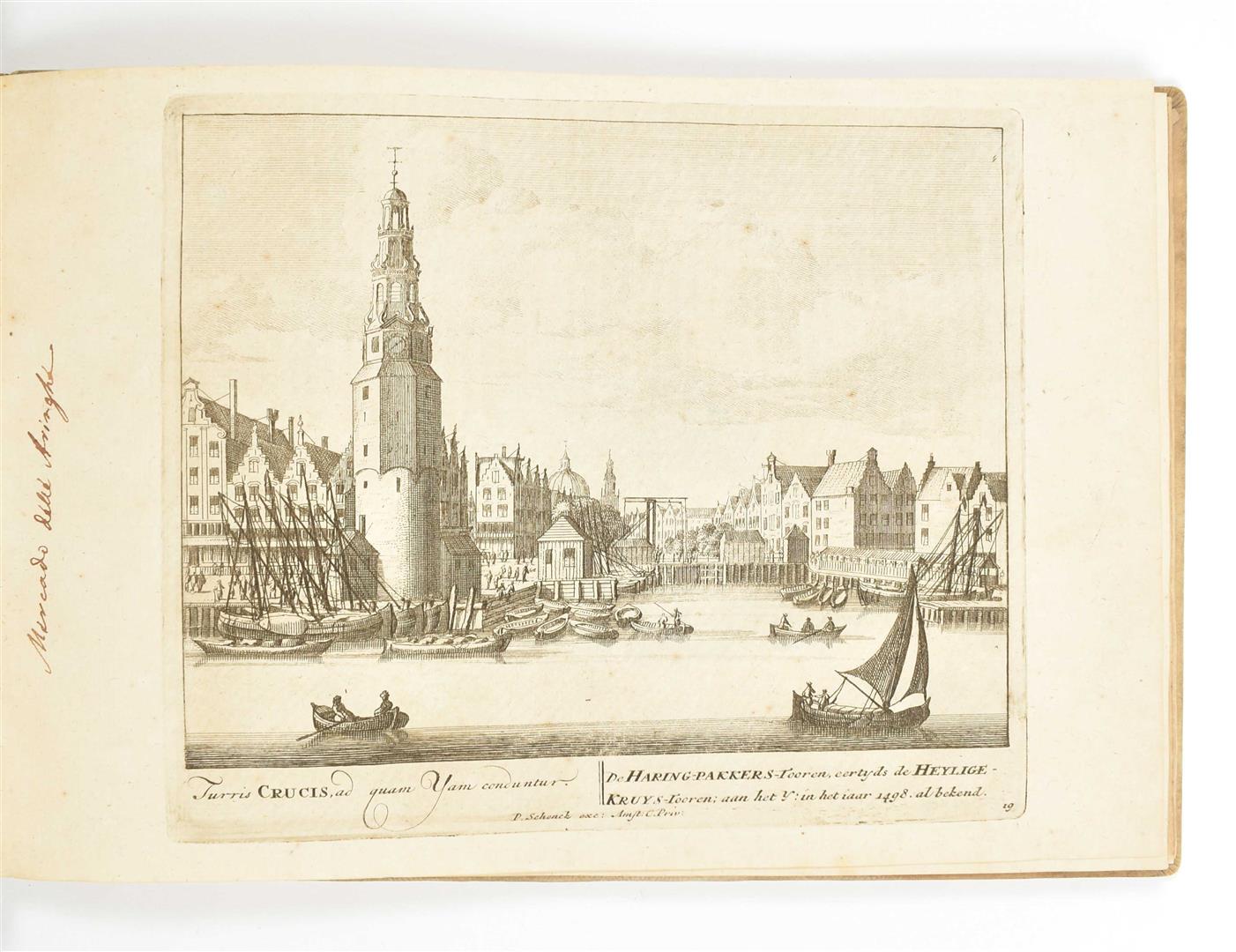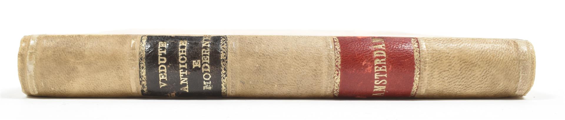 Many views w. caption in pen in Italian in blank inner margin. Dedication re-attached and w. tear, sl. browned at the beginning and end, occas. fingersoiling, modern endpapers. In all, a good and complete copy of this rare reissue of Schenk's own edition entitled "Gezigten der stad Amsterdam en derzelver voornaamste gebouwen", ca. 1695.