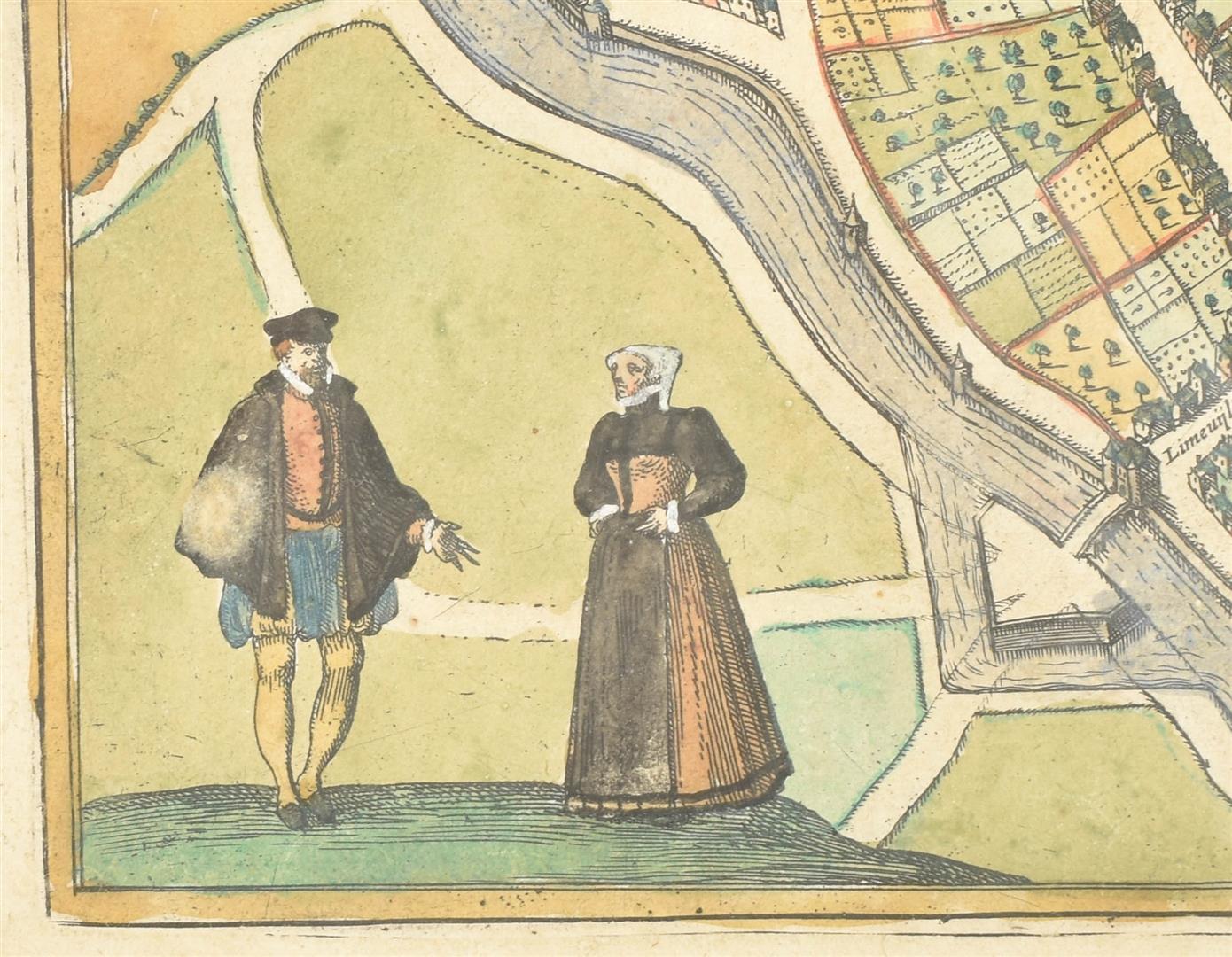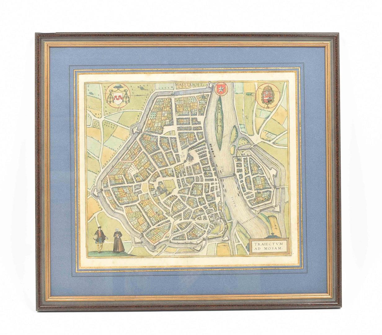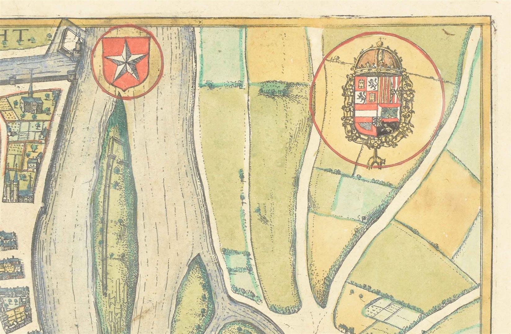 Handcol. engr. bird’s-eye plan w. cartouche & 2 coats of arms. (Cologne, Braun & Hogenberg, ca. 1625). 35 x 40 cm, framed under passepartout and glass.