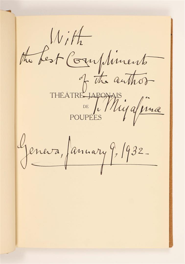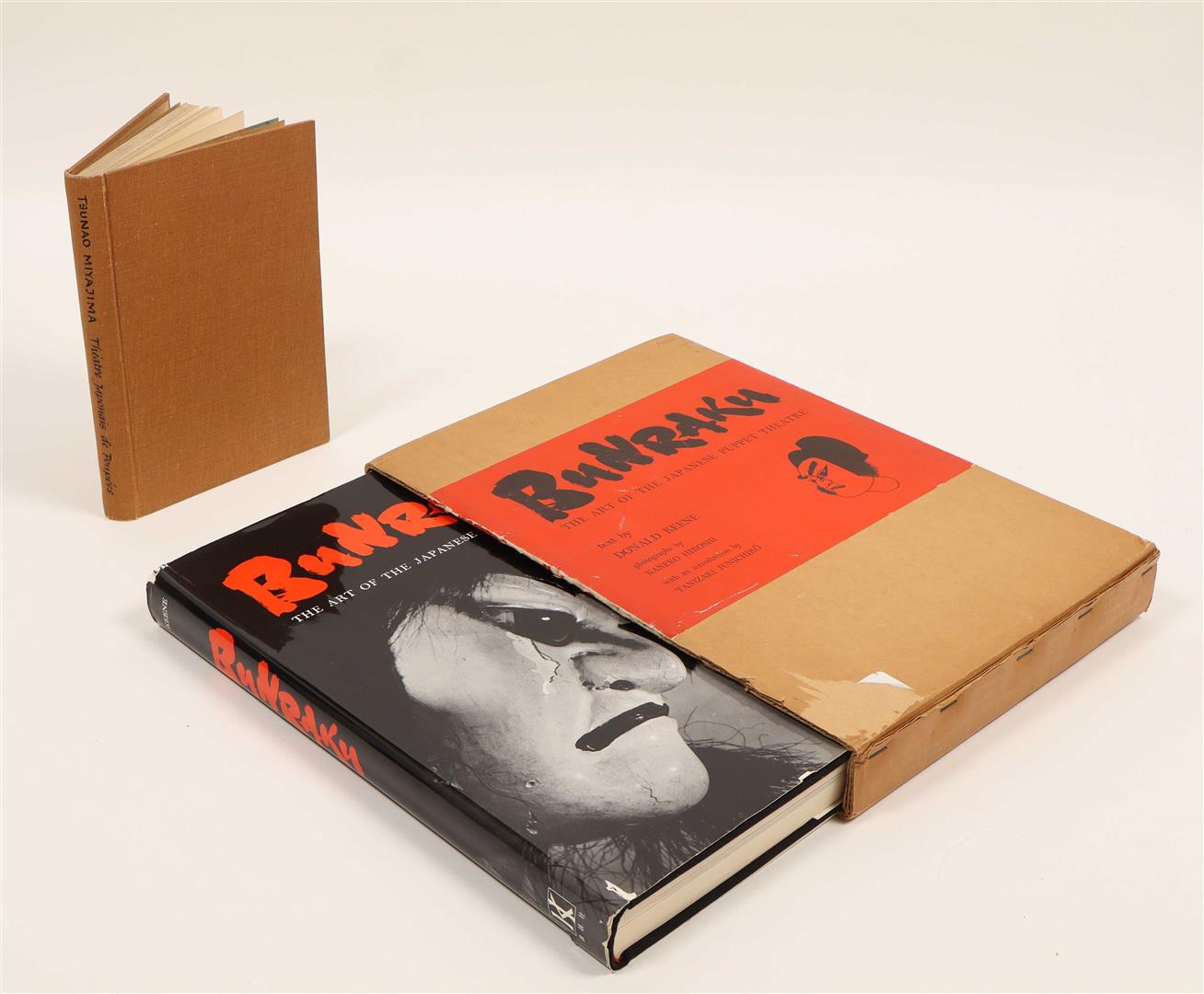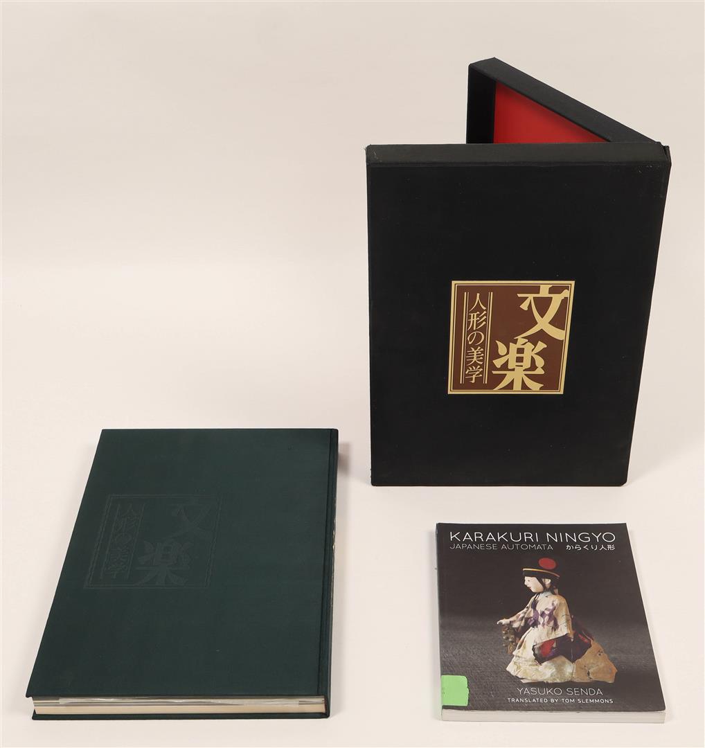 (1) Tsunao Miyajima. Théâtre Japonais de poupées. Kyoto, Institut Franco-Japonais, 1931. 3me éd., entièrement refondue, 1931. Cl. Signed by the author. (2) Donald Keene. Bunraku. The Art of the Japanese Puppet Theatre. Photos by Kaneko Hiroshi. Intr. by Tanizaki Junichiro. Tokyo, Kodansha Int., 1965. W. 7" vinyl record. Cl. w. dust-j., in orig. box. Sm. folio. (3) Mori Shinroku. Bunraku. Aesthetics of Puppets. Mainichi Shimbun, 1974. Profusely illustrated. Text in Japanese w. English summary. Cl. In cassette. Sm. folio. (4). Yasuko Senda. Karakuri Ningyo. Japanese Automata. Sendai, 2012. Transl. by Tom Slemmons. Sc. Library sticker on spine.