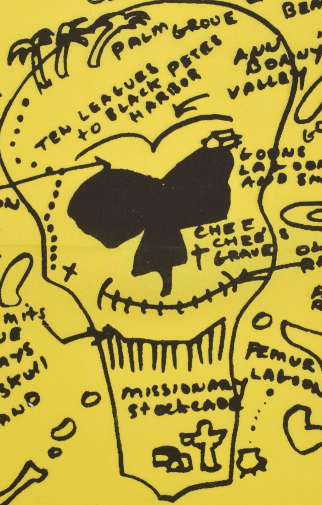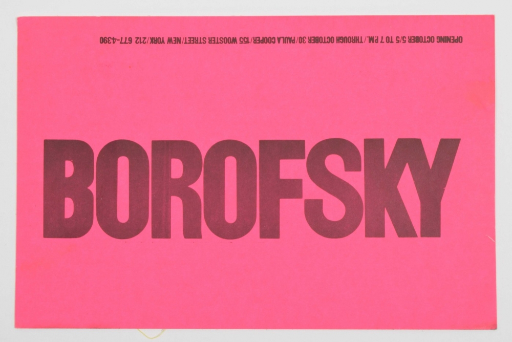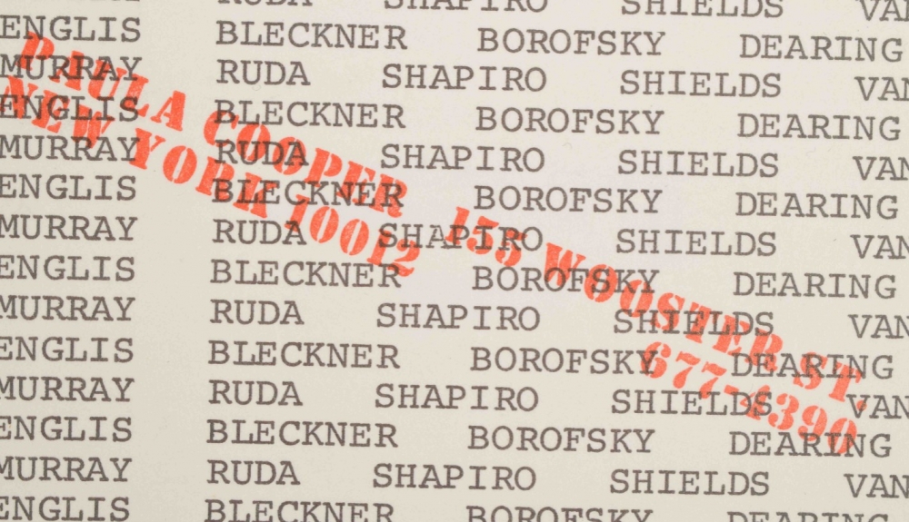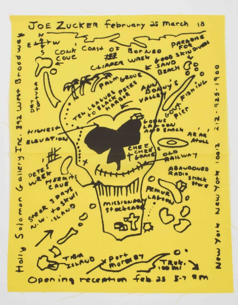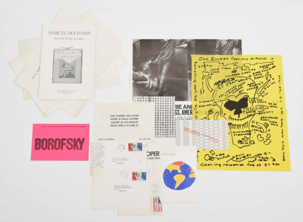 + Striking screenprint on yellow cloth by Joe Zucker, 1984. 33 x 22 cm. In mint condition. + Cards presenting Christopher Knowles (1978) and Marcel Duchamp (1977). + Seven announcement cards by Paula Cooper Gallery featuring Bartlett, Benglis and Bleckner (1975) and a neon pink Borofsky card. (total 21)