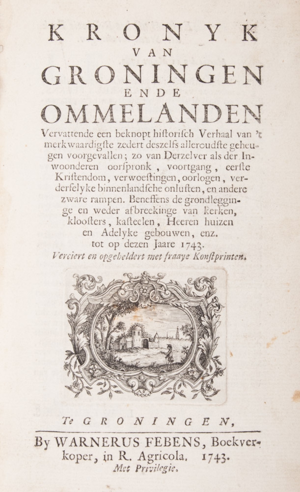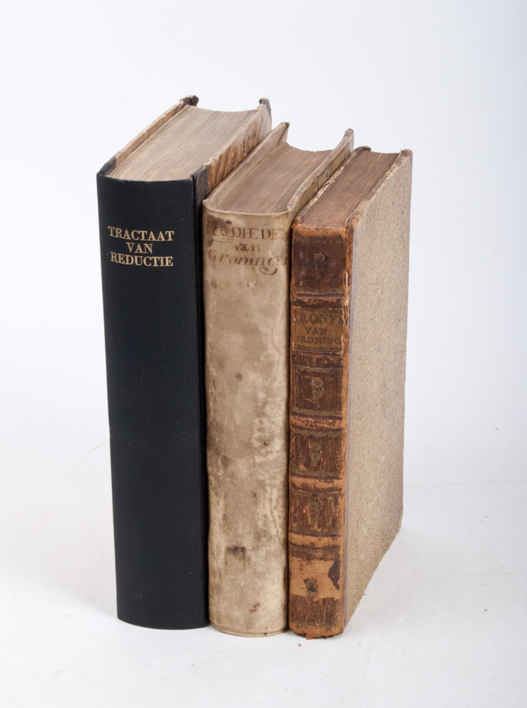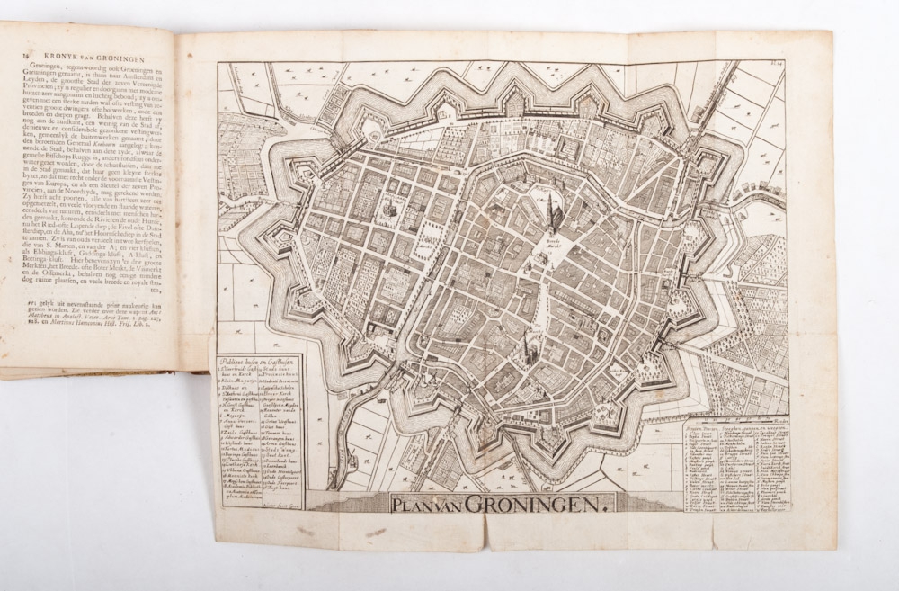 Large 8vo., vellum binding, (26),616,(60) pp., title in ms on spine and front plate, annot. in ms., var. water stains + Kronyk van Groningen ende Ommelanden, (Henricus Hofsnider), Groningen, Warnerus Febens, 1743, with map of the city of Groningen (folding) and 6 smaller maps, all in copperengr. + Verklaring van het Tractaat van de Reductie der Stadt Groningen aan de Unie van Utrecht, Mr. H.L. Wichers, Groningen, J. Dikema, 1794. (3 in total)