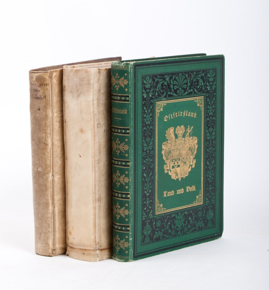 Sm. 4vo., vellum binding, (14),370 pp., name in ballpoint on endpaper, apart from that good copy + Heedendaegse Rechtsgeleertheyt, Soo elders, als in Frieslandt gebruikelijk, Ulrik Huber, second volume, Leeuwarden, Hero Nauta, 1686 + Ostfriesland, F.Fr. de Vries und Th. Focken, Emden, Verlag W. Hannel, 1881. (3 in total)