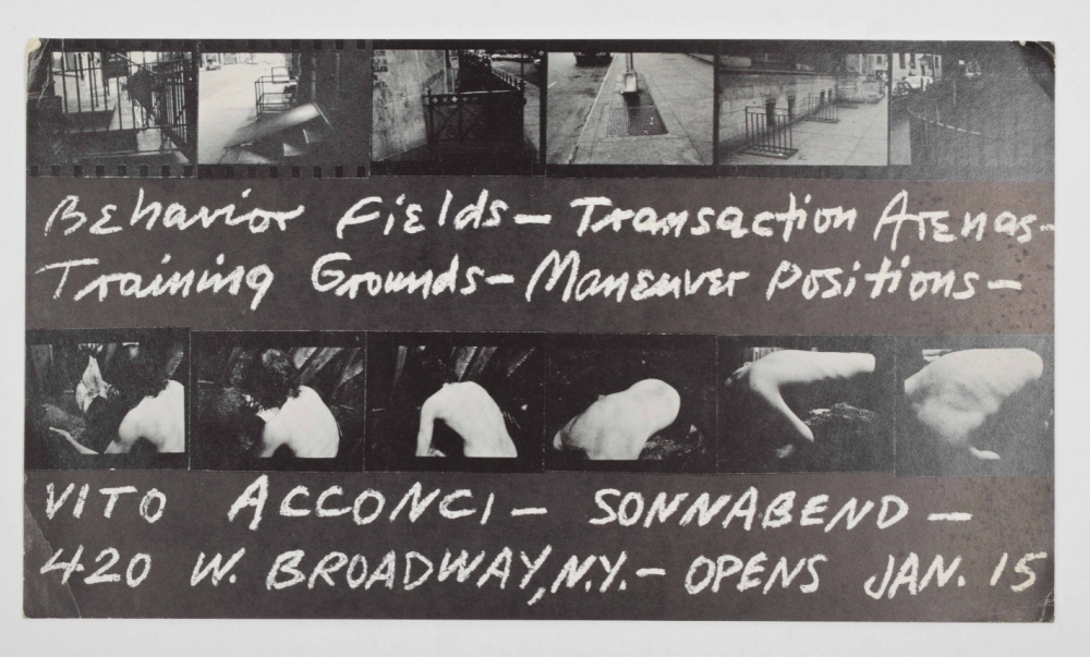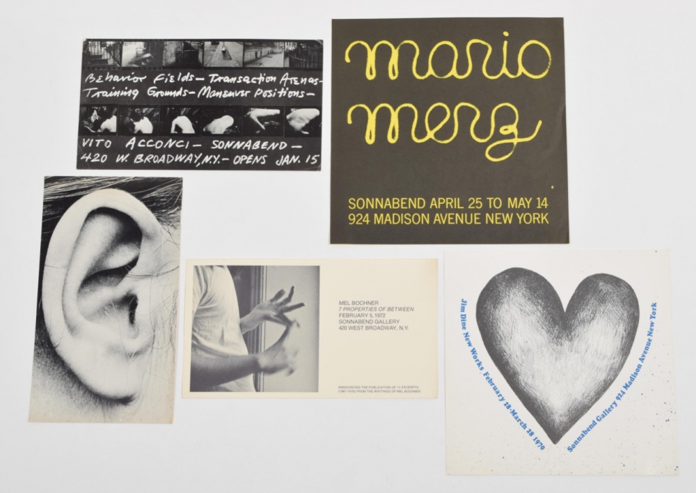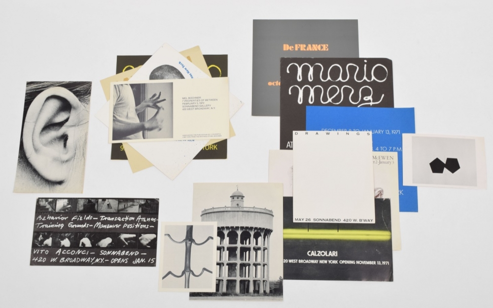 Selection of 15 cards from 1971-1973. Includes Mario Merz, Laddie John Dill, Jim Dine, Hilla and Bernd Becher, Karl Blossfeldt, Jean Dupuy, Mel Bochner (2 cards: 7 properties of between and non-verbal structures), Vito Acconci (Behaviour Fields, Transaction Arenas, Training Grounds, Maneuver Positions).