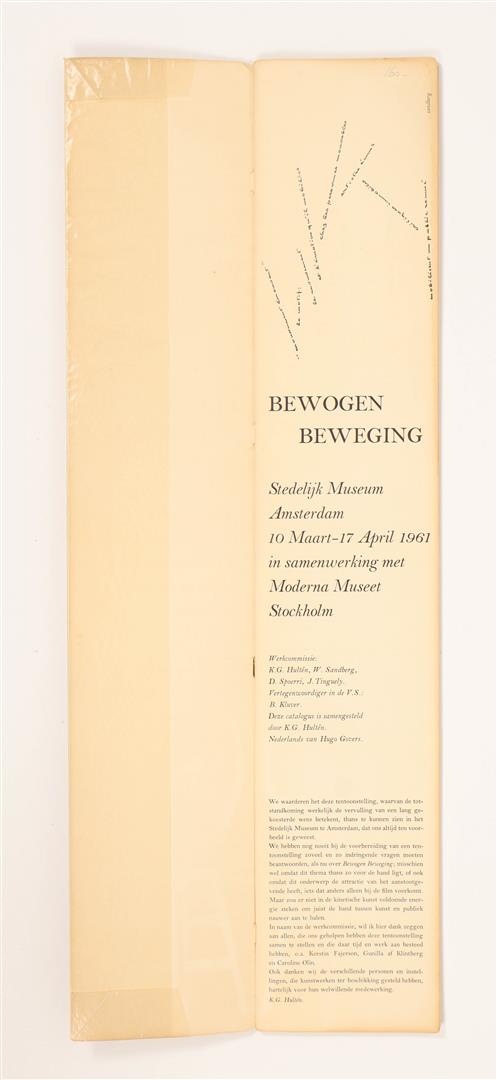 Features a lexicon of artists involved in kinetic art, among them Albers, Brecht, Gabo, Mack, Metzger, Munari, De Saint Phalle, Soto, Watts and many others, as well as a list of exhibited works. Texts mainly in Dutch, with some French, English and German. In glassine protective wrapper. Moderate corner bumps and usual browning of paper edges, fine copy.