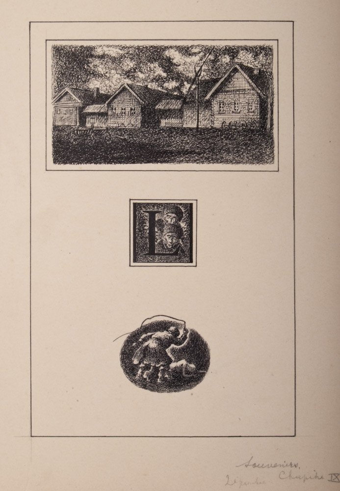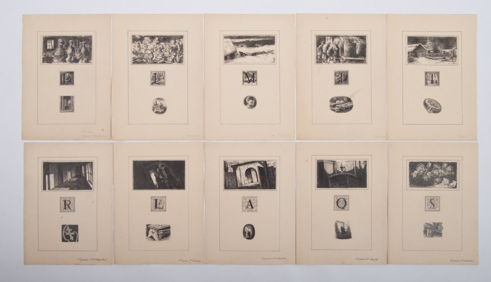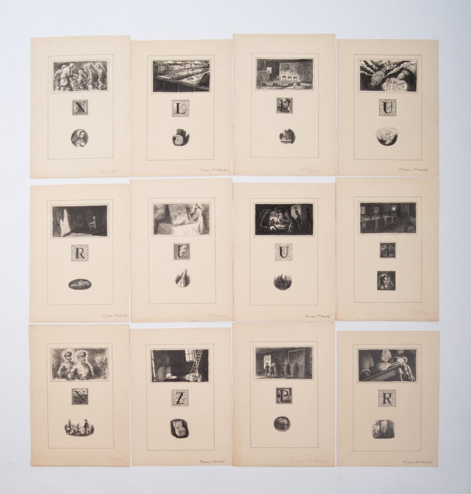 Lot of 24 pen drawings (ca. 18x12 cm.), each consisting of 3 images (illustration, capital, vignette), used as book illustrations.