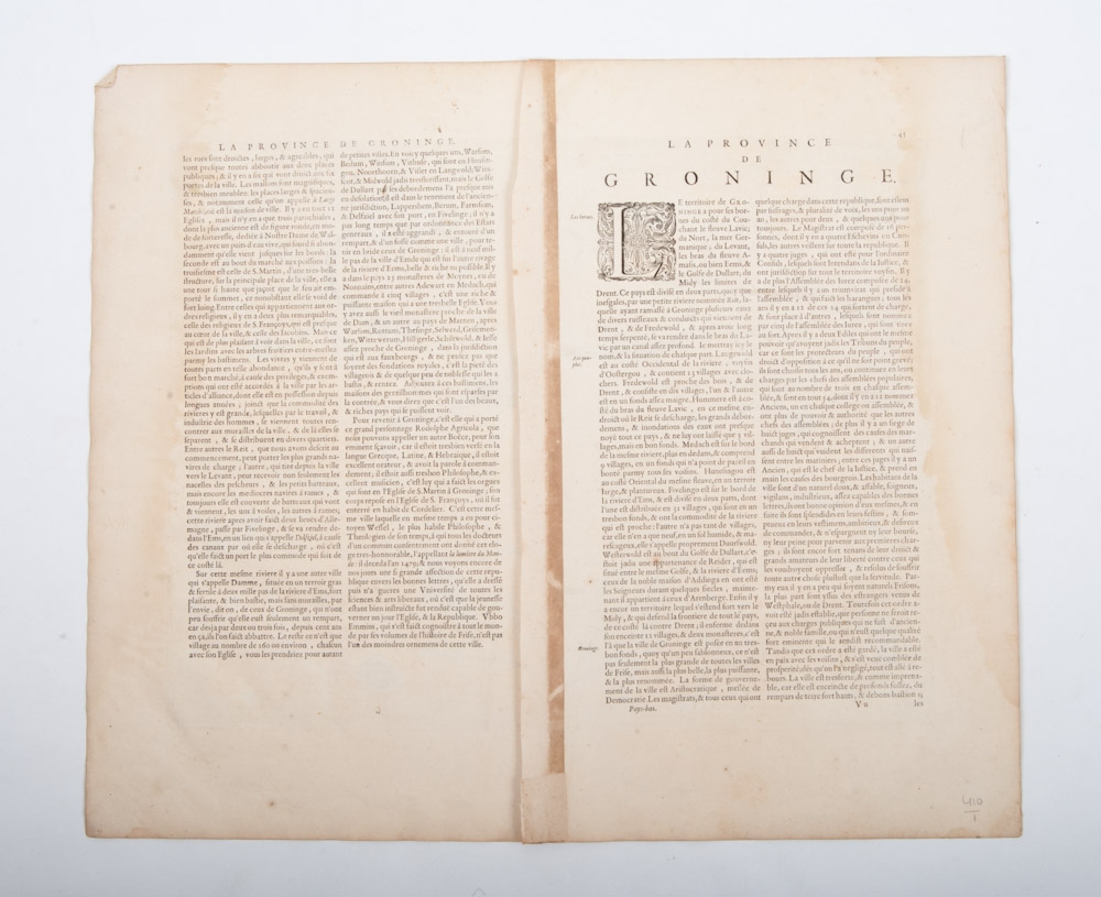 La Province de Groninge, copperengraving, 38x49 cm., original colouring with 2 cartouches also old colouring; colorite beautiful and bold, left and right edge leaf water stained, just touching the map image, fine copy.