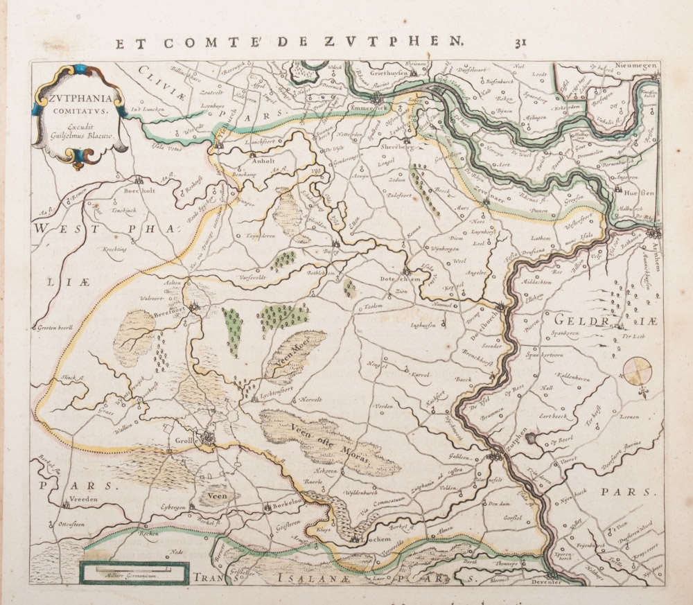 Excudit Guiljelmus Blaeuw. Vgl. Koeman 2:213.1.LJ. Partial map of County Zutphen and the cities of Arnhem, Doesburg, Doetinchem and Deventer, copperengraving 22x26 cm., original colouring. Map in south-north direction.