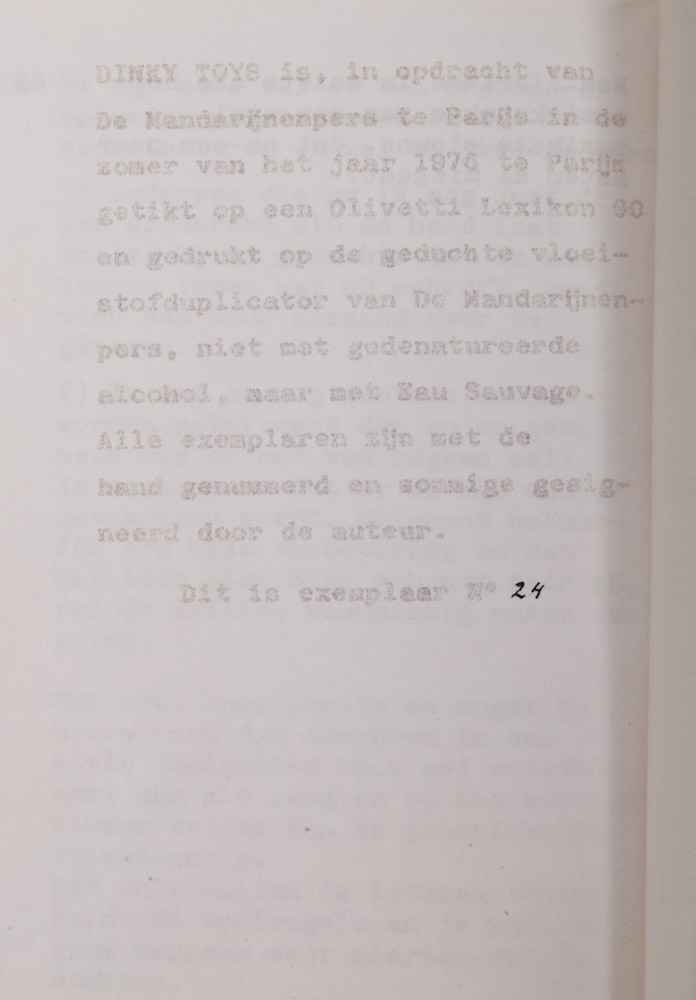 Publication made by Hermans himself on the 'dreaded liquid duplicator of the Mandarijnenpers', typed on an Olivetti Lexikon 90 and with the aid of chemical substances duplicated folded into quires by him. This issue is still uncut. The cover is a unique copy typed in the shape of half a pyramid, monogrammed on the back.
