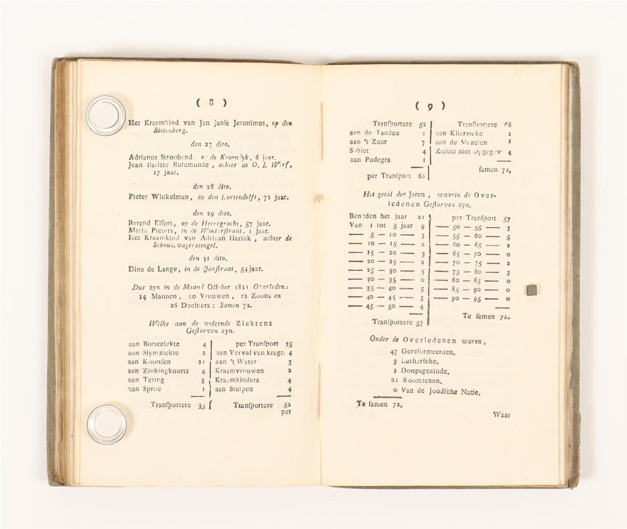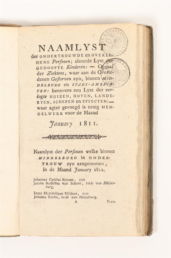Ed. by H.M.C. van Oosterzee. Middelburg, Brothers Abrahams, n.d. (1851-55). 3 vols. (of 5). With 2 lithographic portraits (Antonides van der Goes and Jan Carel Pilaar), 3 fold. views and facsimile letter. Orig. mostly uniform blindtooled buckram w. gilt coat of arms on front cover. Bindings sl. worn along the extremities, occas. trifle soiled, overall in good condition. Added: (2) Naamlyst der ondertrouwde en overledene persoonen [alsmede lyst der gedoopte kinderen], binnen de stad Middelburg en stads-ambachten: benevens eene opgave der ziektens (...). Middelburg, C. Jongkindt, n.d. (1811). 12 parts in 1 vol. Contemp. boards. Rare and important demographic source.
