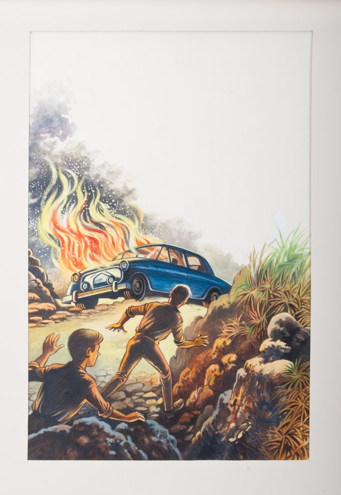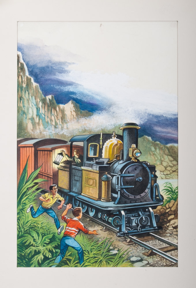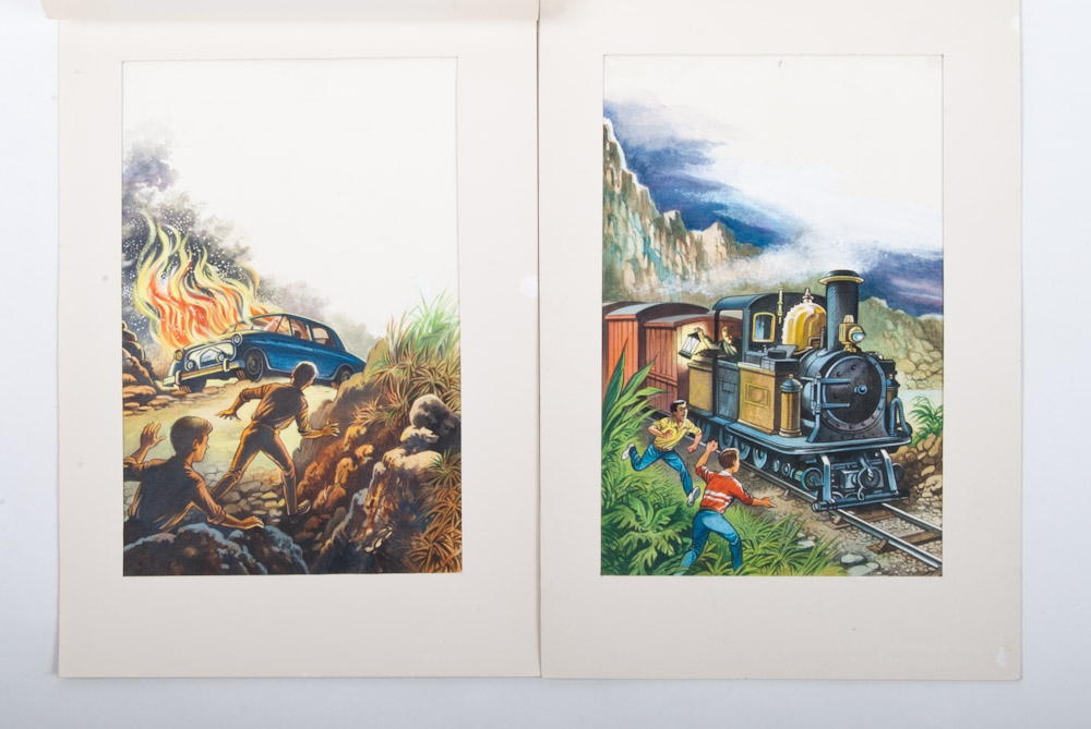 Two gouaches used for the books "Lotgevallen rond een locomotief" 30 x 21 cm. and "Pyjama-rel in Panama" 29 x 20 cm.