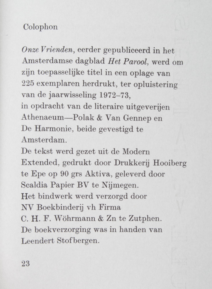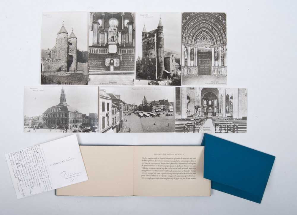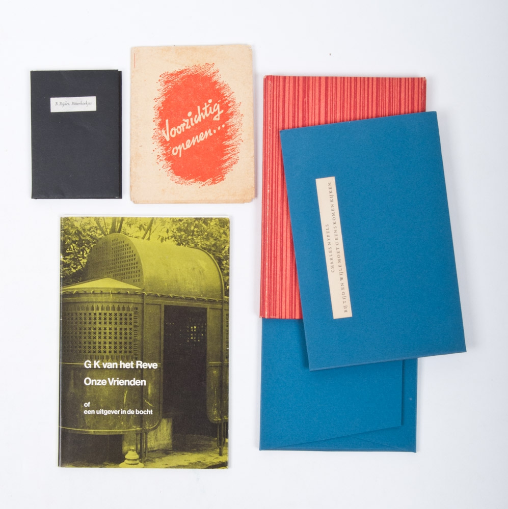 G.K. van het Reve. Onze Vrienden of een uitgever in de bocht. Amsterdam, Atheneum - Polak & Van Gennep, 1972. 24 p. New year's gift 1972-73 from literary publishers Athenaeum-Polak van Gennep and de Harmonie in circulation of 225 copies. + Charles Nijpels - Bij Tijd en Wijle moet u eens komen kijken. Maastricht in zeven prentbriefkaarten. De Tuinwijkpers, 1968. Book and folder picture post cards in case + B. Rijdes. Bitterkoekjes. Haarlem, de Tuinwijkpers, 1968. Size. 7,5 x 5,3 cm. no. 11/48 - and 1 other.