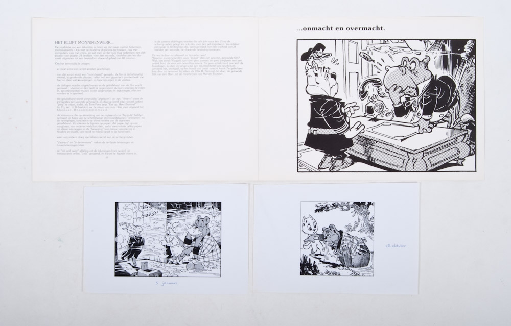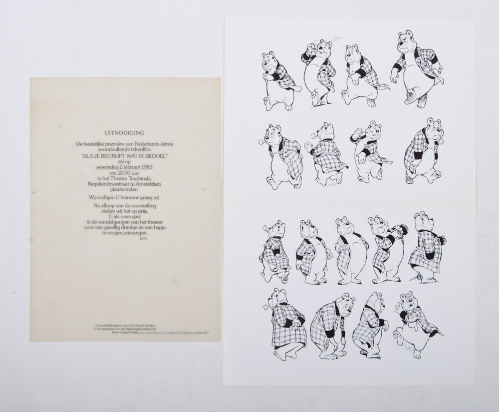 Rob Houwer presenteert...Nederlands eerste avondvullende tekenfilm Heer Bommel en Tom Poes van Marten Toonder. Promotiemateriaal, 1980 waarin de productie van een avondvullende tekenfilm van de hand van Toonder en Houwer wordt aangekondigd. 24 pp. with photographs and texts. Probably not circulated, or in very small circles. + The invitation to the celebratory premiere of the first feature-length cartoon film of the Netherlands "Als je begrijpt wat ik bedoel" in Tuschinski, 2 February 1983. Without the RSVP card for the tickets.