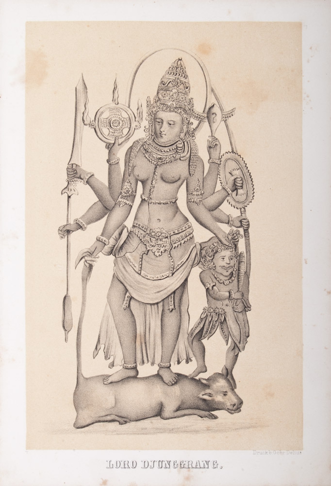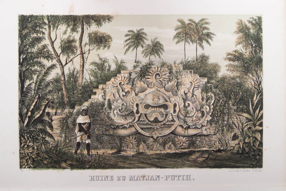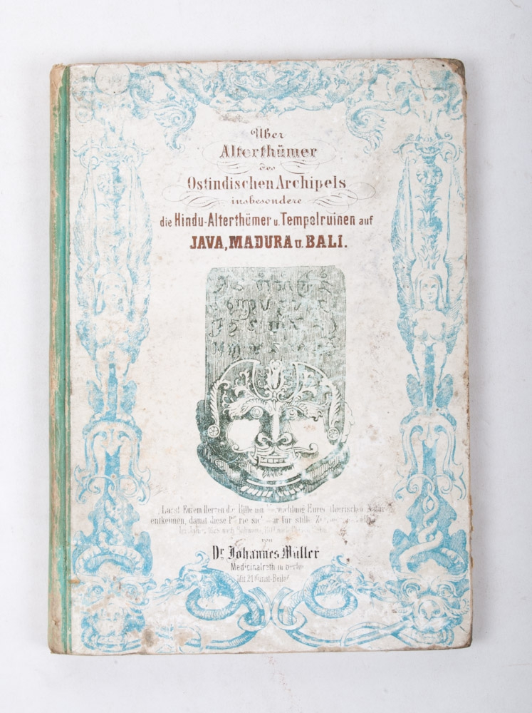 insbesondere die Hindu-Alterthuemer und Tempelruinen auf Java, Madura und Bali, nach Mittheilungen Brumunds und v. Hoevells aus dem hollaendischen bearbeitet von Dr. Johannes Mueller. Berlin, im Selbstverlag des Verfassers, 1859, (printed by C. Schultze, Berlin), first edition, IV,102 p., 21 (coloured or tinted) lithographs, original cardboard binding, large 8vo.