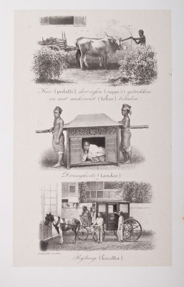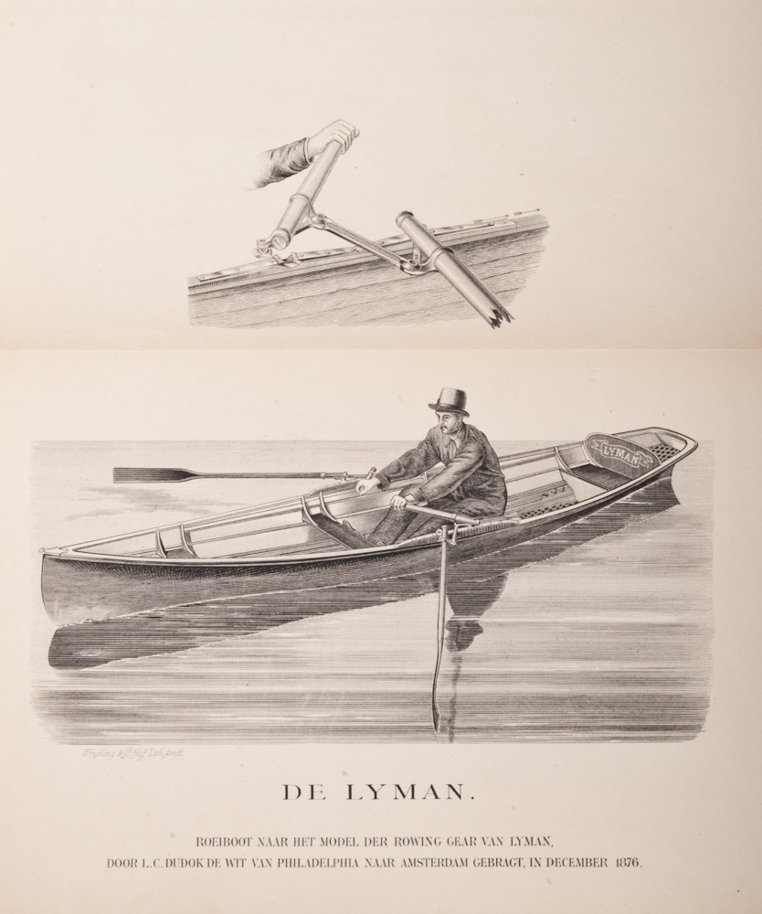 Contains beautiful panoramas of Batavia, Soerabaja, Samarang and Soerakarta. The print of the frigate contains 16 hand-coloured flags with explanations and a letter print legenda with 100 ship details. The separately inserted extra print shows a man in a rowing boat like the one the author brought from Philadelphia to Amsterdam. Wikipedia has a short article about the author who is known under the nicknames of Kees de Tippelaar and De Wandelende Hollander (the Walking Dutchman).