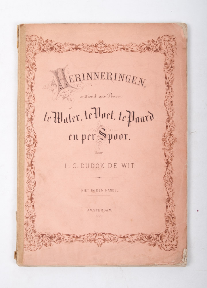 Door L.C. Dudok de Wit [Kees de Tippelaar]. Niet in den Handel. Amsterdam, (Tresling & Co.), 1881, 44 p., with large folding coloured map of Java and 40 illustrations on 17 lithographed prints, inserted separately is an EXTRA folding print, original lithographic cover, small folio.