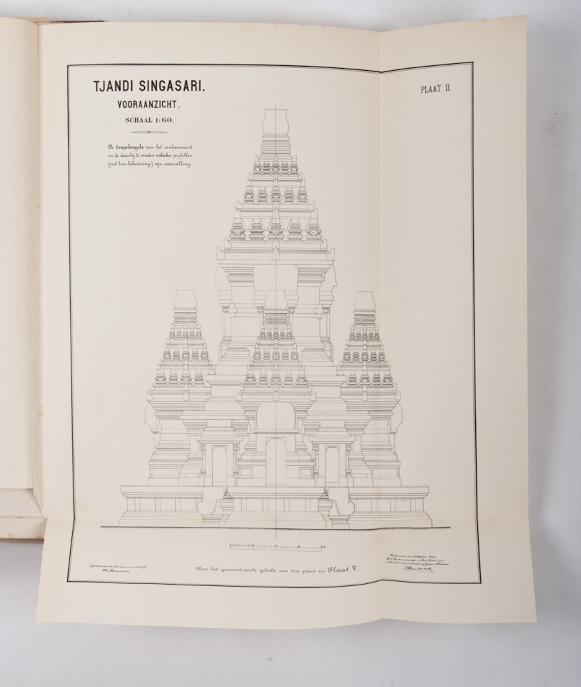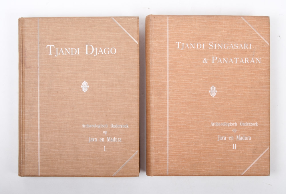I. Beschrijving van de ruïne bij de desa Toempang, genaamd Tjandi Djago, in de residentie Pasoeroean. II. Beschrijving van Tjandi Singasari; en de Wolkentooneelen van Panataran. Samengesteld (...) onder leiding van (wijlen) Dr. J.L.A. Brandes. Benevens eene herdenking van Dr. J.L.A. Brandes (...) door G.P. Rouffaer. Met 104 platen, 24 bouwkundige teekeningen, en 1 kaart (I). Met 113 platen, 19 bouwkundige teekeningen, en 2 kaarten (II). Den Haag/ Batavia, M. Nijhoff/Albrecht & Co., 1904/1909, 2 delen, XII,116; XI,(1),XLVI* (herdenking Brandes),116,50* p., richly illustrated, original uniform cloth, folio.