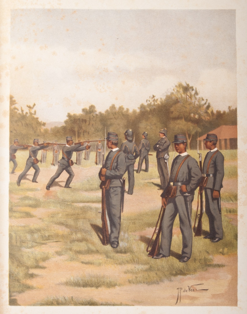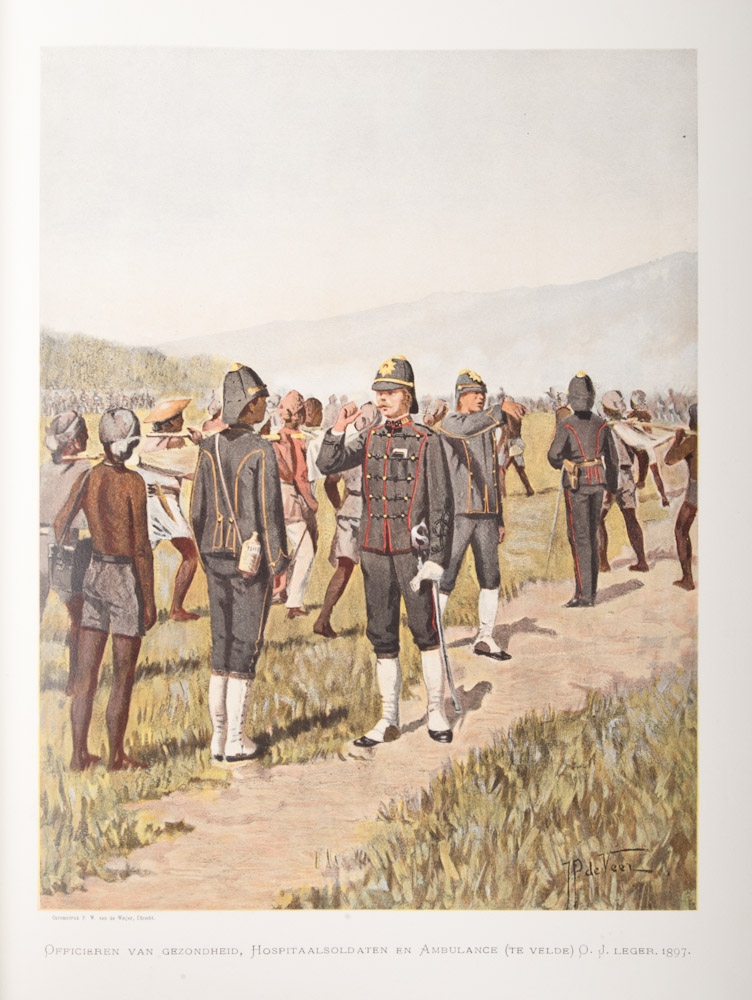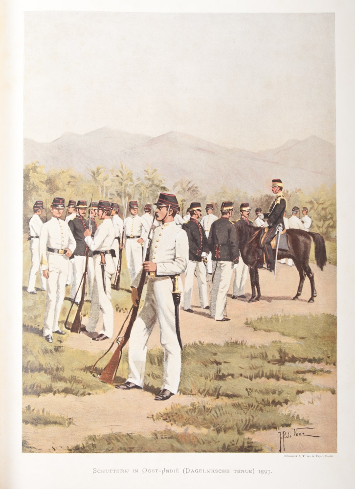 Tijdvak 1890-1900. Regeering van Koningin Wilhelmina. Tweede gedeelte, het leger in Oost- en West-Indië. (Den Haag, Gebroeders van Cleef, 1900), text pp. 205-235 and the corresponding 16 chromolithographed prints LXV-LXXX by J.P. de Veer, modern cloth, folio.
