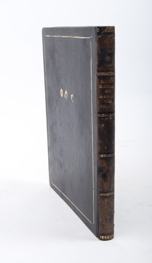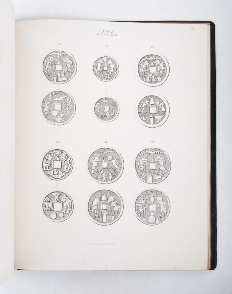 Most prints with small brown water stain, 7 prints with large stain, binding also a little stained. Canonical work on Indonesian and Malaysian coins, with highly detailed prints. With blindtooling, name and annotations in pen by J.S. van Coevorden on (French) title.