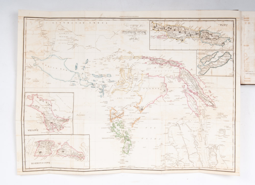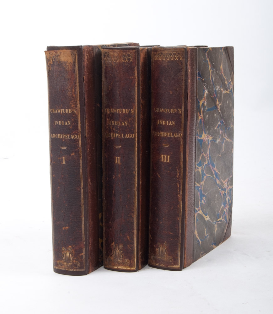 Containing an account of the manners, arts, languages, religions, institutions, and commerce of its inhabitants. By John Crawfurd, F.R.S. Edinburgh, printed for A. Constable etc., 1820, 3 parts, VIII,520; VI,563; VI,554,(4 print index) p., with splendid, large folding hand-coloured engraved overview map of the archipelago and 34 steel-engraved prints, contemporary gilt uniform half-leather.