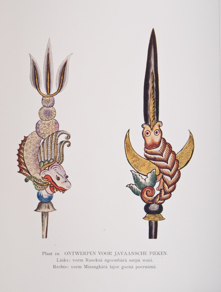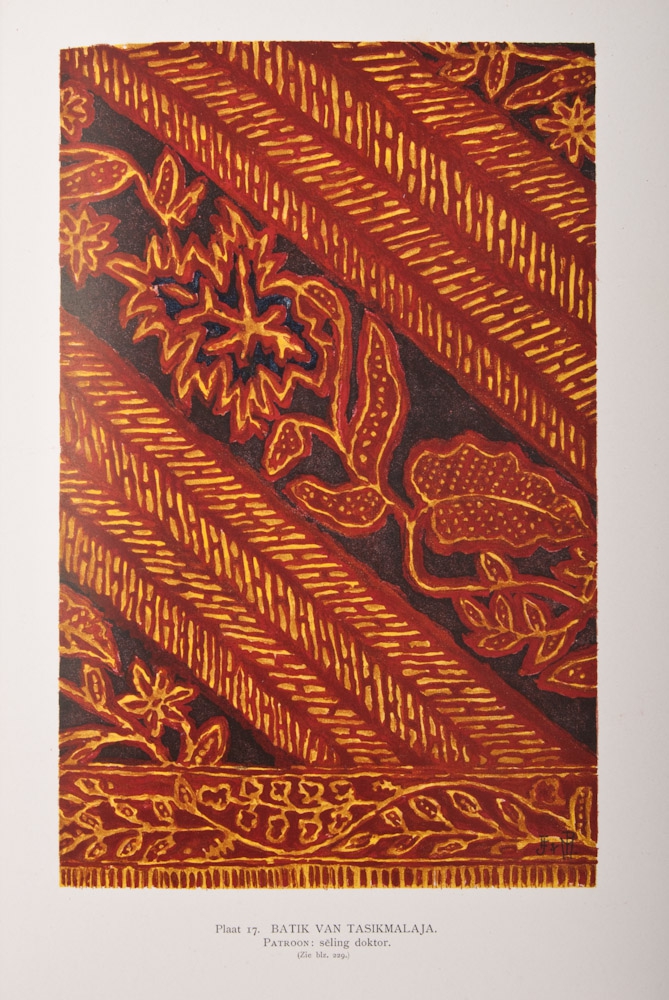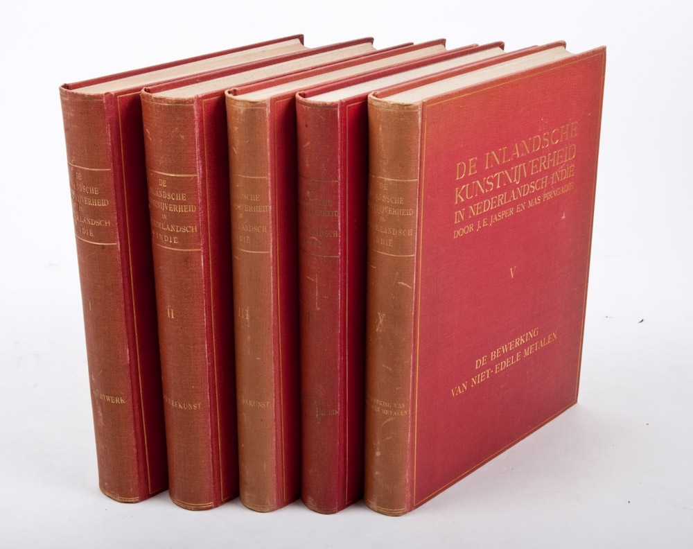 door J.E. Jasper en Mas Pirngadie. I. Het vlechtwerk. II. De weefkunst. III. De batikkunst. IV. De goud- en zilversmeedkunst. V. De bewerking van niet-edele metalen. Den Haag, 1912-1930, richly illustrated, original uniform filt-stamped cloth, large 4to.