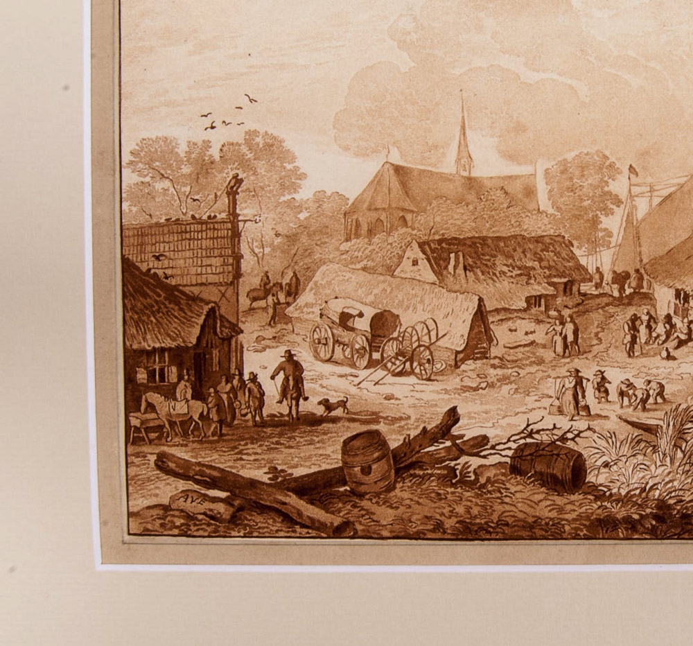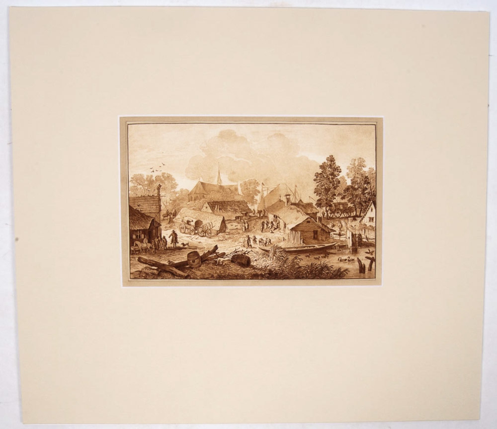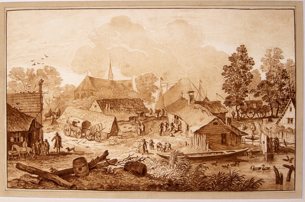 Nederland, ca. 1770. Signed AVE. Pastoral village scene. Church and ships in background. Brown India ink. 18 x 28 cm.