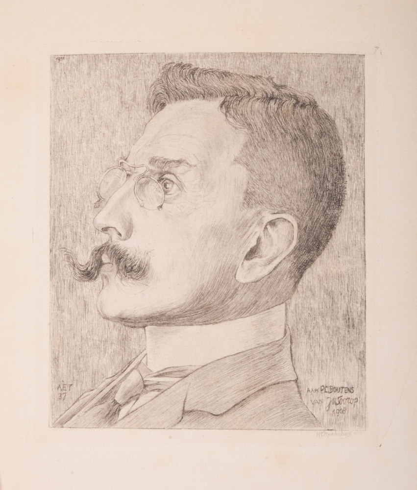 Amsterdam, P.N. van Kampen & Zoon. [1912]. First edition. Luxury copy. One of thirteen copies with portrait etched by H. E. Roodenburg after pencil drawing by J. Th. Toorop, on Dutch paper and bound in vellum, numbered, signed and dated: Nr. 3, P.C. Boutens, 27 febr. 1912. Spine after design by Walter TIemann with gold print, top end, gold gilt tipped. Beautiful specimen.