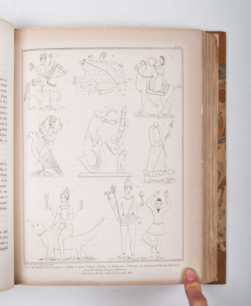 with notices of various mountain and island tribes, inhabiting the two peninsulas of India and the neighbouring islands; and an appendix, comprising the minor avatars, and the mythological and religious terms, &c. &c. of the Hindus. With plates illustrative of the principal Hindu deities, &c. By Charles Coleman. London, Parbury, Allen, and Co., 1832, XVIII,401,(1 blank),(2) p., with 39 lithographic plates (incl. frontispiece), 20th century half leather in antique style, 4to.
