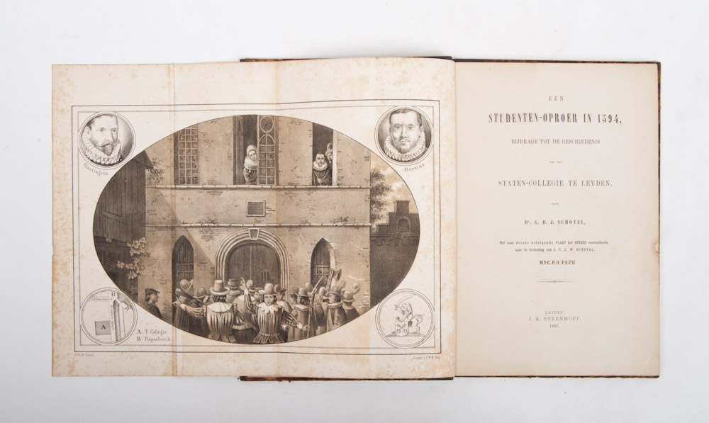 With: Een studenten-oproer in 1594, bijdrage tot de geschiedenis van het Staten-College te Leyden, door Dr. G.D.J. Schotel. Leiden, J.K. Steenhoff, 1867, 4,104 p., folding tinted lithogr. plate, contemporary half-cloth, 4to (spine strip missing).