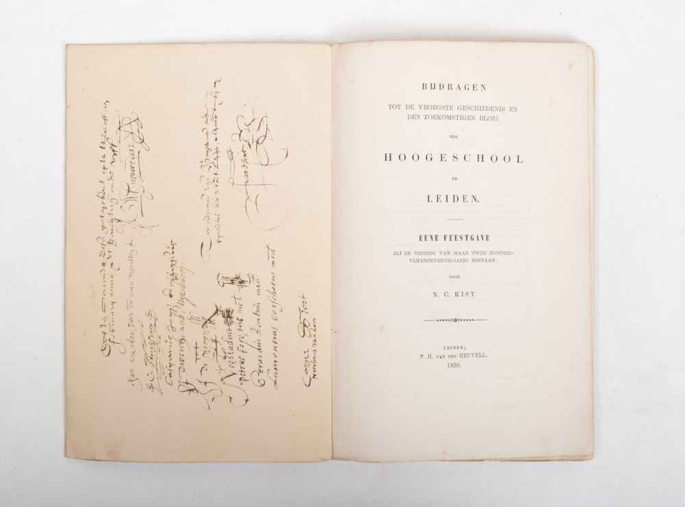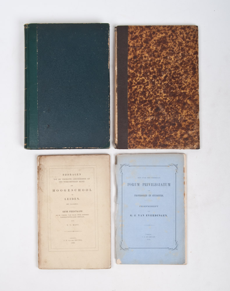 And with: Bijdragen tot de vroegste geschiedenis en den toekomstigen bloei der Hoogeschool te Leiden. Eene feestgave bij de viering van haar twee honderd vijfenzeventig-jarig bestaan, door N.C. Kist. Leiden, P.H. van den Heuvell, 1850, (6),125,(1) p., with facsimile frontispiece, original printed cardboard binding, large 8vo (defect on spine) and with 1 other. (4 in total)