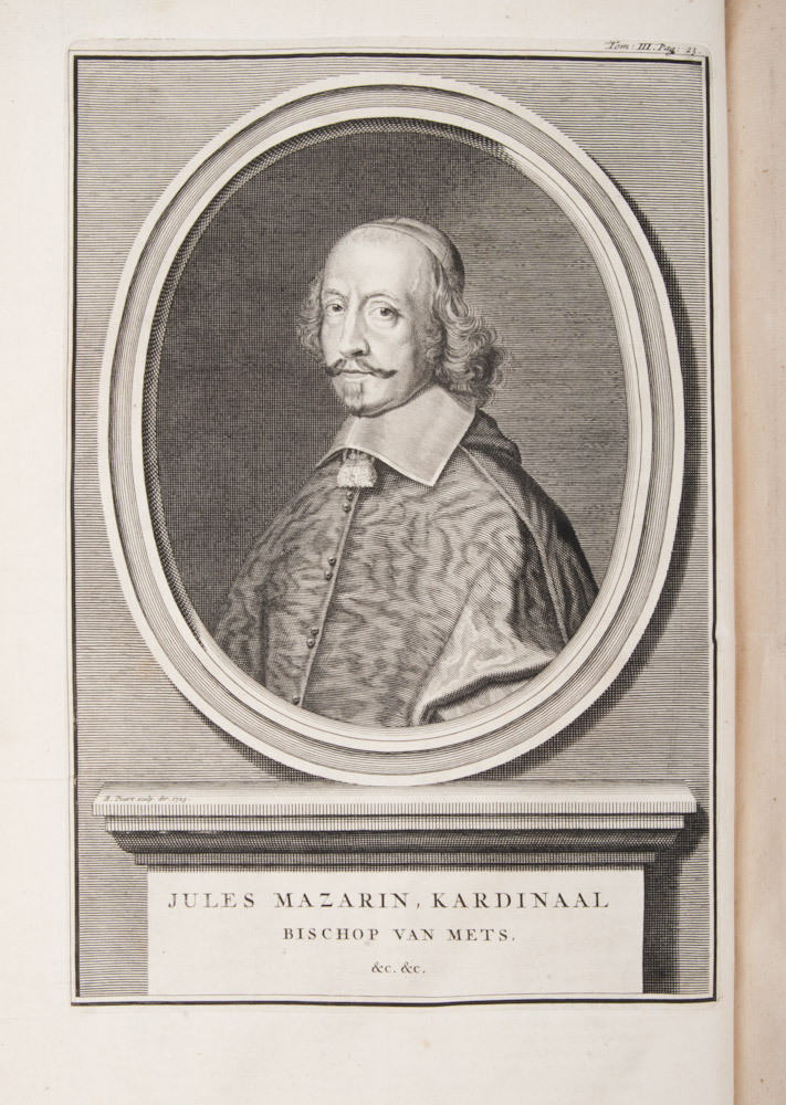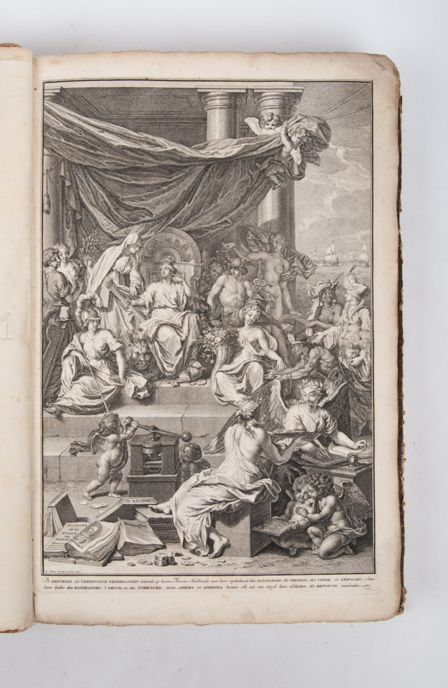 Small folio, half leather, 3x frontispiece by various engravers, 3x title in red and black with vignette, (22),396,706,723 pp. + byvoegzel (supplement) + bladwyzer (bookmark), complete with 109 engravings of portraits, sieges, sea battles etc. The bindings worn, insides good; the print in powerful impressions.
