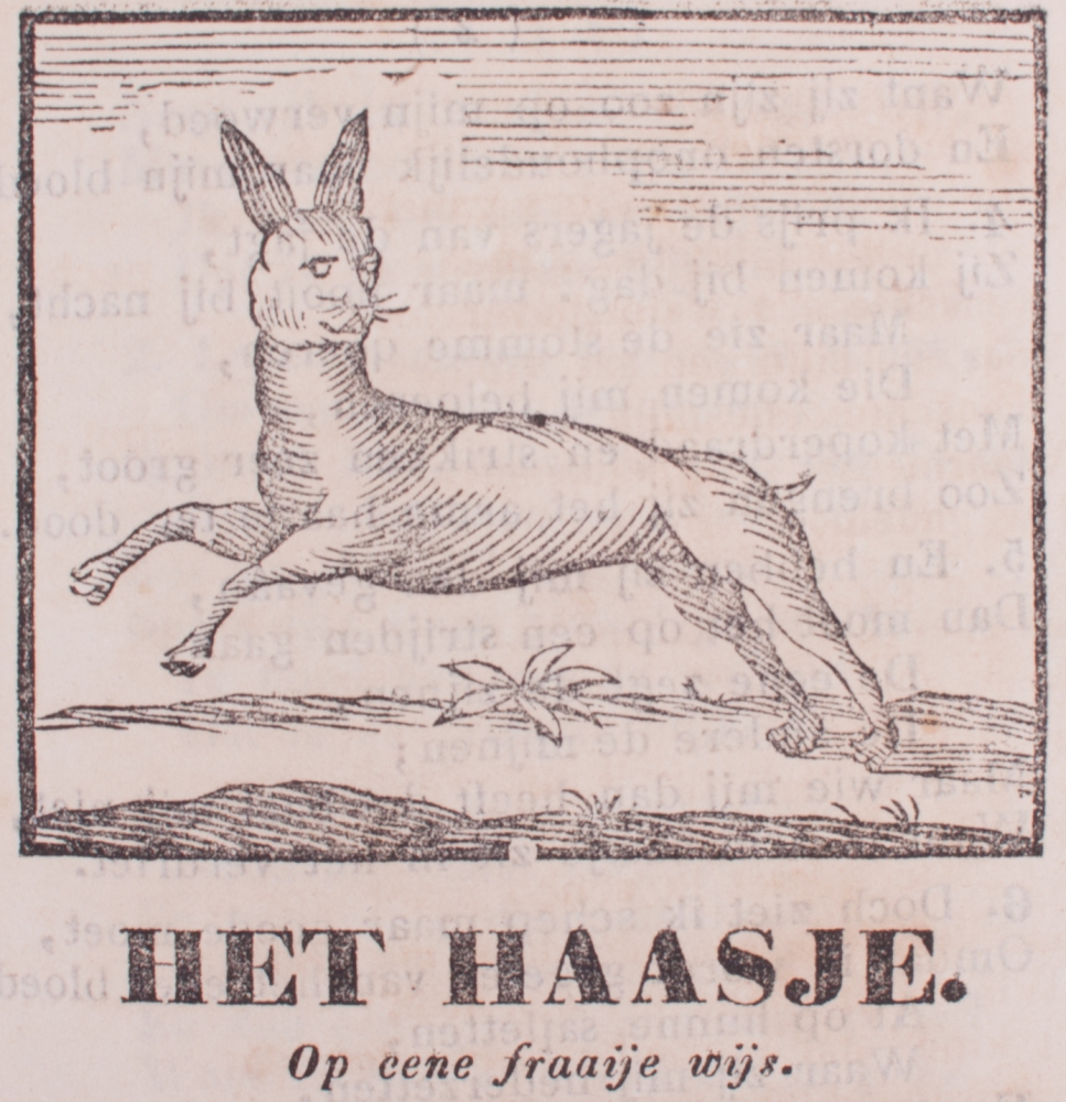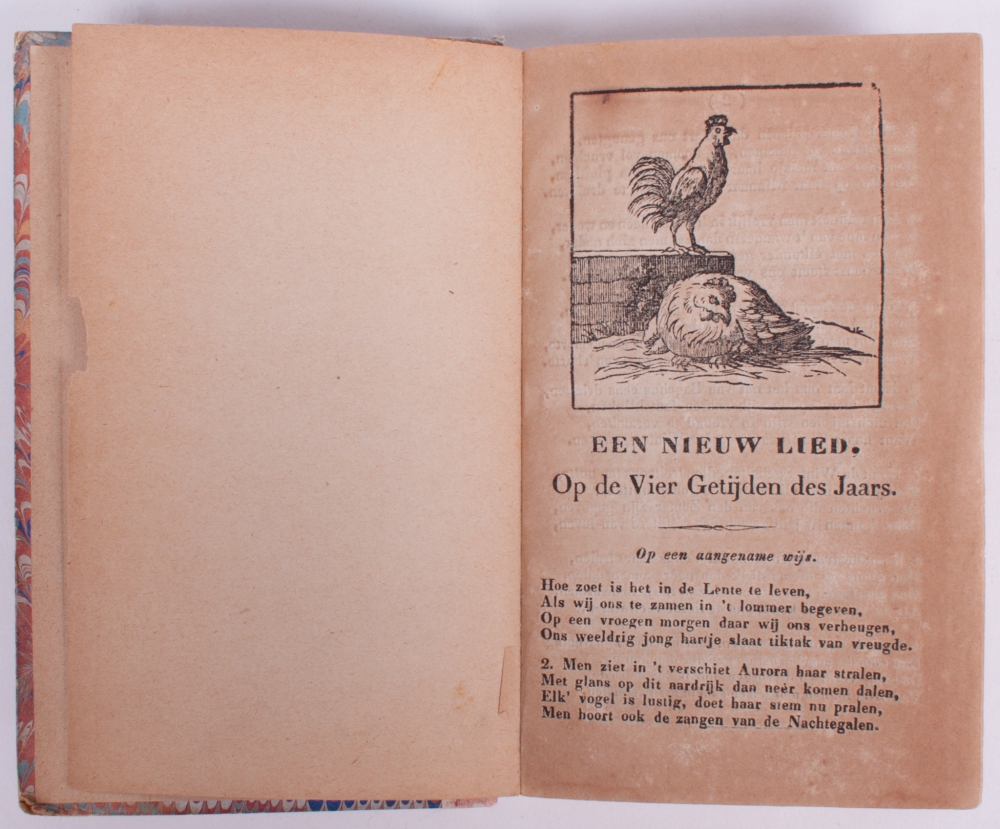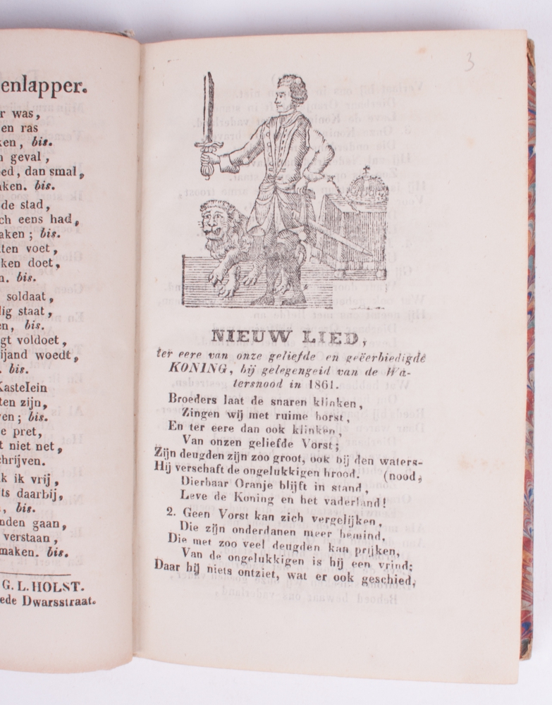 Extremely rare populare editions, by the printer F.G.L. Holst (active 1841-1864) only a few publications in Picarta. Our composite book consists mostly of (love) songs (some with a date in the title): "Nieuw lied, ter eere van onze geliefde en geëerbiedigde koning bij gelegenheid van de Watersnood in 1861"; "Het Vrouwtje van Stavoren"; "Eene geestelijke minnezang, toegezongen van eene Heidensche Konings Dochter, aan hare opperste bruidegom"; "De verliefde Minnaar"; "Nieuw lied, van de soldaat en de keukenmeid"; "Het Scheveningsche Meisje"; "Het Haasje"; "Een nieuw Lied. Van de Smulpartij van een Meisje met haar Vrijer"; "Lucht-ballon, of Het bedrukte meisje"; "Vreeselijke Vrouwenmoord, gepleegd te Haarlem (volgens de Couranten). Vrijdag, 23 Januarij 1852 (...)."