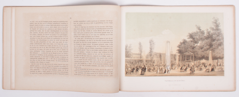 Rare publication with wonderful plates by C.C.A. Last after T.C. Bruining: I. Plegtige inhaling der reünisten; II. De Maskerade op de Breedestraat; III. De Breedestraat bij illuminatie. IV. Vauxhall op de ruïne; V. Vuurwerk op de ruïne; V. Vauxhall op de Vink.