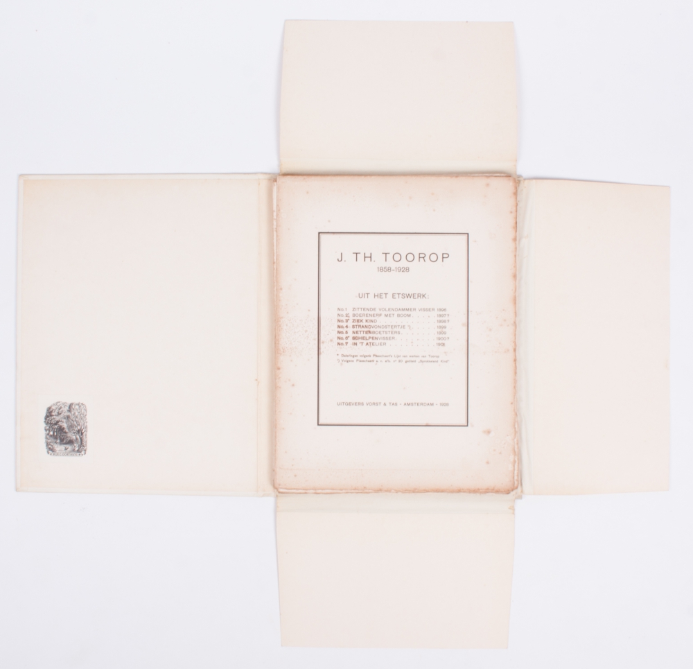 Uit het etswerk. Vorst & Tas, Amsterdam, 1928. Loose-leaf publication in cloth folder with 7 reproductions in the style of etchings by Toorop. No. 51/250.