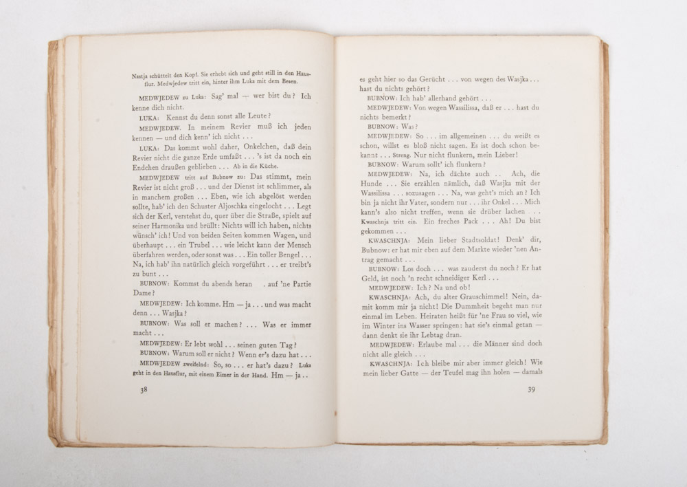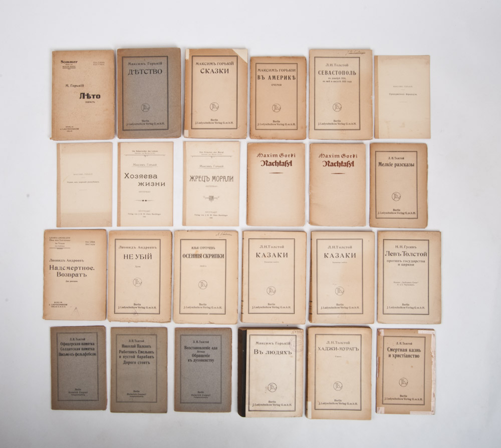By Maxim Gorki: Onder vreemde mensen, Zomer, Mijn Jeugd, In Amerika, Sprookjes der werkelijkheid, 4 smaller publications by Gorki, all in Russian and Nachtasyl (2x) in German in a first and later edition. [all between 1900 and 1920]. (total 24)