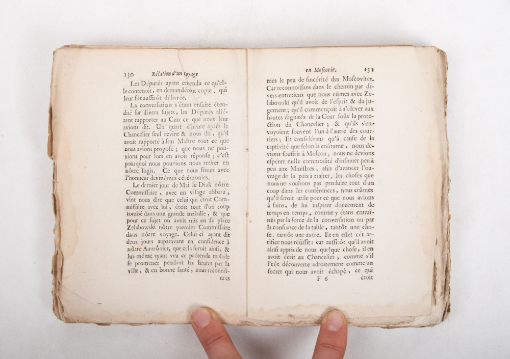 12mo., paper cover, protected with Japanese paper, back missing, title with vignette, 381 pp., waterstained in front. First edition of the French translation of the Latin original from 1668. The author was a German diplomat in the court of Tzar Alexei Michaelovitch. Mayerberg's account of his experiences contains much useful information about the Russian customs and manners in the 17th century. Rare. Combined with: Histoire ou anecdotes sur la Revolution de Russie; en l' annee 1762. Paris. Desenne. 1797 and: Neue Anekdoten von Peter dem Grossen durch Johan Golikow, Riga und Leipzig, W.C.A. Mueller, 1802 and: Peter de Groote en Karel de Groote met elkanderen vergeleeken. A.I.L. von Wackerbarth, Amsterdam, Holtrop, 1793. (total 4)