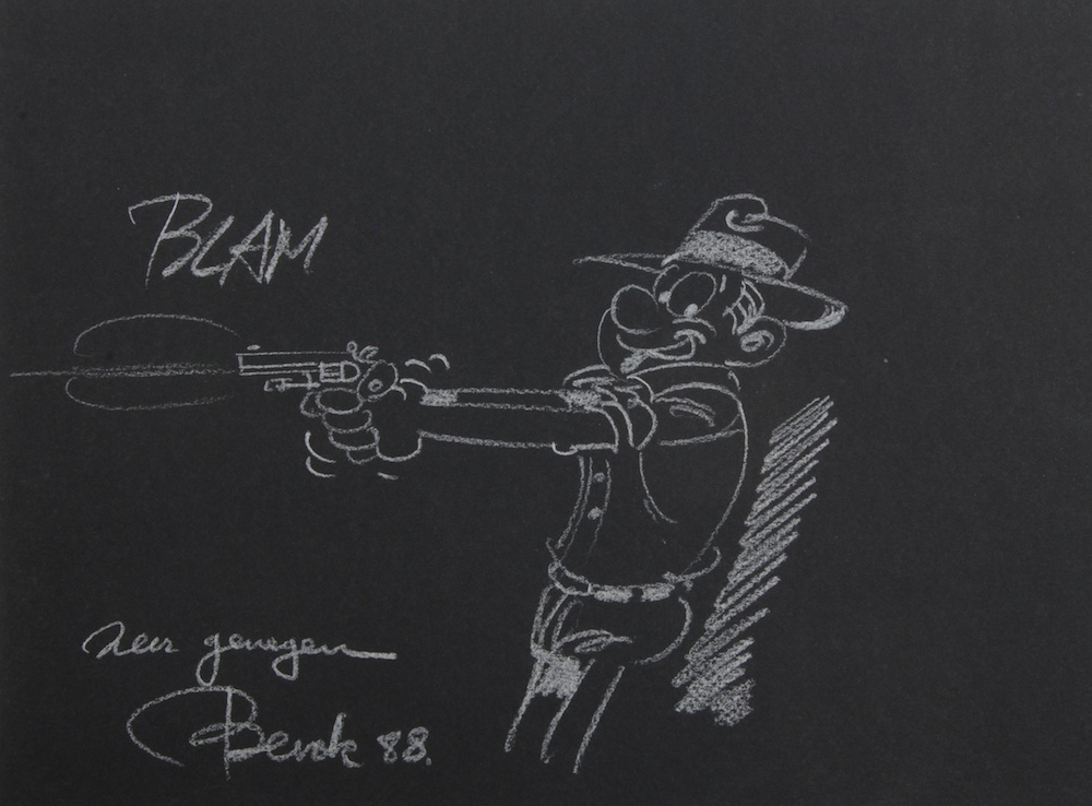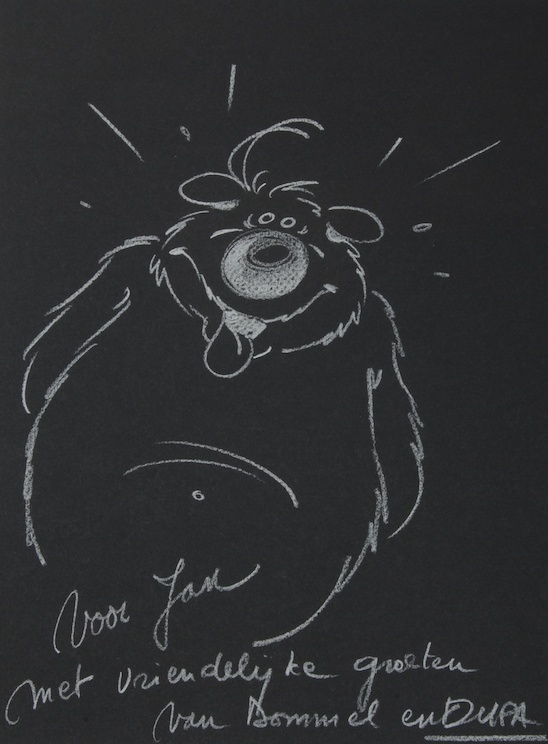 On black paper detailed drawing of Sammy in white pencil. "zeer genegen, Berck '88" + Dupa - Dommel. On black paper drawing of Dommel in white pencil - and 1 other.